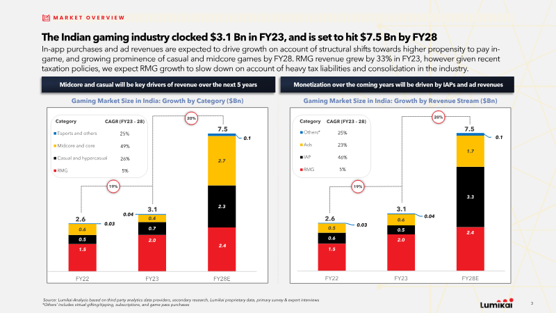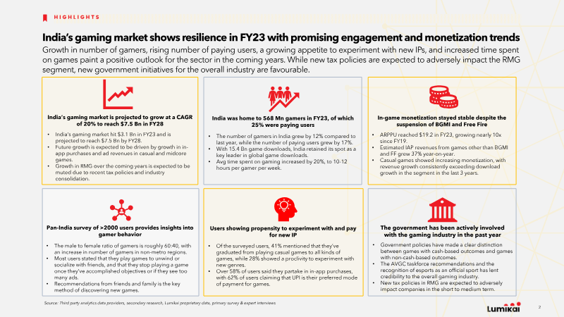 The Indian interactive media and gaming market reached a valuation of $3.8 billion in FY24, representing a significant 30% share of the country’s broader $12.5 billion new media sector. Growth is characterized by a 20% five-year projected CAGR, with expectations to exceed $9.2 billion by FY29. This expansion is primarily driven by a 41% year-on-year increase in in-app purchase revenue, particularly within the midcore segment, which grew by 53%. While Real Money Gaming (RMG) remains a major contributor, recent changes to the GST regime have led to margin compression and increased user acquisition costs for operators in that sub-sector. The player base in India has expanded to 590 million gamers, with 148 million identified as paying users. Engagement metrics show a 30% increase in average weekly time spent, rising from 10 to 13 hours. Demographic data reveals a diversifying landscape where 44% of gamers are women and 66% reside in non-metro cities. Notably, there is a high degree of overlap between gaming categories, as over 60% of RMG paying users also spend money on midcore titles. Payment behaviors are heavily modernized, with 83% of users utilizing UPI or digital wallets for transactions. The regulatory environment is shifting toward formal recognition and support, with the government identifying gaming as a "sunrise sector." New frameworks distinguish between RMG and Free-to-Play (F2P) games for taxation purposes, while esports has been officially integrated under the Ministry of Youth Affairs and Sports. These findings are based on a mixed-methods research design conducted between May and October 2024, incorporating a primary survey of 2,269 smartphone users across 16 Indian cities alongside secondary analysis of financial statements and proprietary industry data.