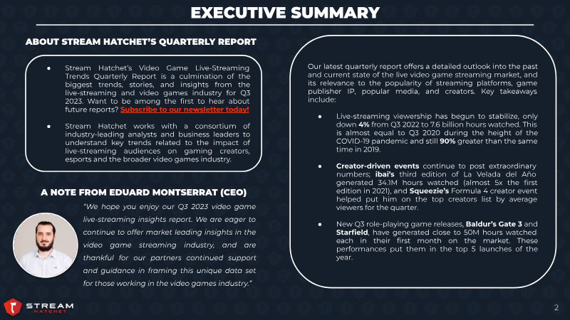 This analysis of the video game live-streaming market for Q2 2023 highlights a period of stabilization and strategic shifts following the post-pandemic boom. While overall viewership declined by 9% compared to the previous quarter, the industry remains significantly larger than its pre-pandemic state, with total hours watched up 97% over Q2 2019. The data covers major global platforms including Twitch, YouTube Gaming, Facebook Live, and the emerging competitor Kick, utilizing data aggregated through third-party APIs and manual classification. A primary finding is the rapid ascent of Kick, which secured a 2% market share to become the fifth most-watched platform. Kick’s growth was driven by a creator-friendly 95-5 revenue split and high-profile signings like xQc and Amouranth, leading to a 204% increase in unique channels. Notably, Kick’s content mix differs from Twitch; while Twitch remains 74% gaming-focused, over two-thirds of Kick’s viewership comes from non-gaming categories, specifically "Just Chatting" and "Slots & Casino." In the gaming sector, League of Legends reclaimed the top spot for hours watched, followed by Grand Theft Auto V and VALORANT. The report emphasizes the impact of new releases, specifically Diablo IV, which generated 164 million hours watched in its first month. Blizzard’s use of a "Hardcore Mode" challenge demonstrated the efficacy of creator-led marketing, as 29% of the game's first-week viewership was tied to this specific challenge. The esports segment showed resilience, growing 4.1% year-over-year despite the broader market cooling. The analysis also notes the continued dominance of female VTubers on YouTube and the trend of esports organizations relying heavily on content creators for viewership, with eight of the top ten teams drawing over 50% of their audience from creators rather than competitive matches.