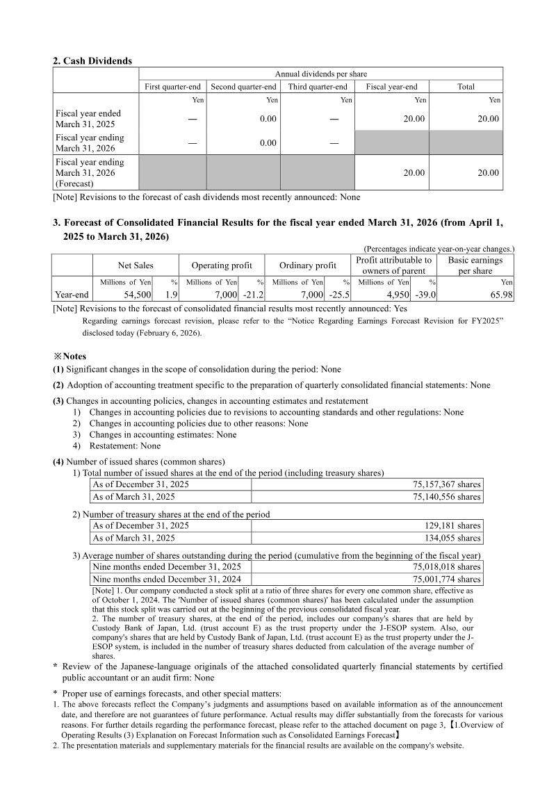 TOWA Corporation’s consolidated financial results for the nine months ended December 31, 2025, reflect a challenging period characterized by a year-on-year decline in both revenue and profitability. Net sales reached 36,930 million yen, representing a 5.9% decrease compared to the same period in the previous year. Operating profit fell significantly by 43.5% to 3,685 million yen, while profit attributable to owners of the parent declined by 49.0% to 2,627 million yen. These results were primarily driven by a shift in product mix, increased development costs, and the adverse impacts of U.S. tariff policies and sluggish demand within the automotive semiconductor sector. The company operates across three primary segments: Semiconductor Manufacturing Equipment, Medical Device, and Laser Processing Machine. The Semiconductor Manufacturing Equipment business, which constitutes the majority of total sales, saw a 6.0% decline in revenue to 33,940 million yen. While the Medical Device segment experienced a modest revenue increase of 7.8%, the Laser Processing Machine business faced a 20.0% decline in sales and an operating loss of 86 million yen. Despite these headwinds, the company reported a strong order environment, particularly for AI and data center-related memory applications, with third-quarter orders reaching their second-highest level on record. As of December 31, 2025, the company’s financial position remains stable with total assets of 101,357 million yen and an equity-to-asset ratio of 66.6%. Looking ahead, the company has revised its full-year forecasts downward due to delayed revenue recognition from mass production investments and higher costs associated with initial shipments. However, management anticipates a recovery trend, supported by a robust order backlog and expected improvements in product mix as demand for compression equipment grows.