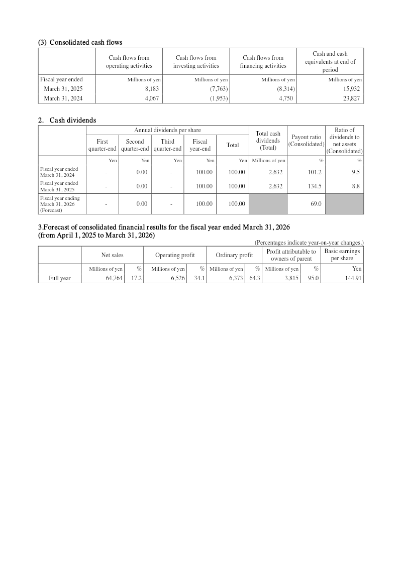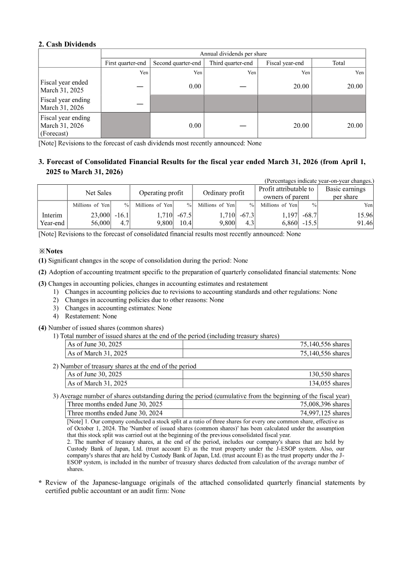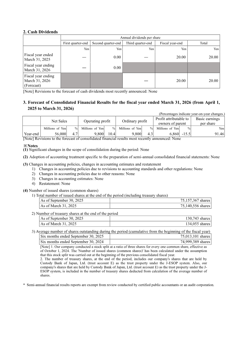France Bed Holdings Co., Ltd. released its consolidated financial results for the six-month period ending September 30, 2025, prepared in accordance with Japanese GAAP. The report details the company’s operating performance, financial position, and cash flow status, while maintaining its previously announced earnings forecasts for the full fiscal year ending March 31, 2026. During the first half of the fiscal year, the company reported net sales of 29,259 million yen, remaining essentially flat compared to the same period in the previous year. However, profitability metrics experienced a decline, with operating profit falling 16.0% to 1,782 million yen and ordinary profit decreasing 17.7% to 1,765 million yen. Profit attributable to owners of the parent reached 1,047 million yen, representing a 20.9% year-on-year decline. Basic earnings per share for the period were 31.20 yen, down from 38.36 yen in the prior year. The company’s financial position as of September 30, 2025, shows total assets of 67,084 million yen and net assets of 39,158 million yen, resulting in an equity-to-asset ratio of 58.3%. Cash flows from operating activities provided 2,541 million yen, while investing and financing activities reflected ongoing capital allocation, including the purchase of treasury shares and continued investment in property, plant, and equipment. Looking ahead to the full fiscal year ending March 31, 2026, the company maintains its forecast of 62,300 million yen in net sales and 4,750 million yen in operating profit. These projections reflect a modest growth expectation of 2.8% in sales and 1.1% in operating profit compared to the previous fiscal year. The company continues to operate under stable accounting policies with no significant changes in the scope of consolidation.