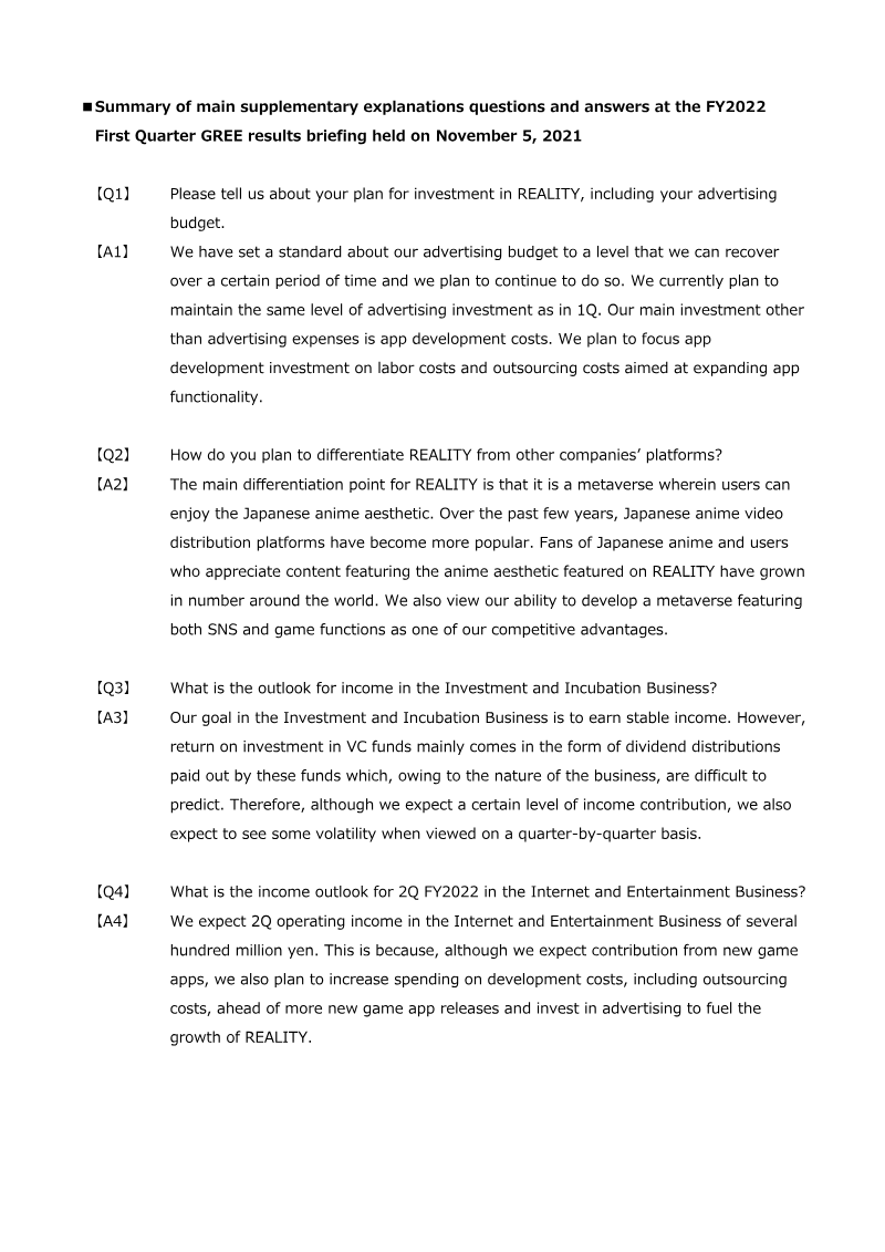 The briefing addressed key financial and operational questions for GREE’s first quarter of FY2020. A decline in sales was attributed to a reactive drop following anniversary events for major titles in the previous quarter and strategic title transfers aimed at improving profitability. Management projected operating income of roughly ¥0.5 billion for the second quarter, with strong expectations for core titles but a continued decline in browser game revenue; advertising spend was to increase on high‑potential games. Overseas distribution of SINoALICE remains uncertain in China due to regulatory approval, while other regions rely on local partners and progress is ongoing. Global release strategy now allows simultaneous launches in Japan and abroad, with timing set on a case‑by‑case basis after partner consultation. Challenges for AFTERLOST – Shoumetsu Toshi include attracting new fans while retaining existing ones, despite extensive fan‑targeted measures. Cost‑cutting through title transfers is viewed as a means to improve profitability, with plans to broaden the title lineup. Earnings contribution from REALITY depends on internal factors such as lifetime value enhancement and external 5G infrastructure development; the focus is on steady content portfolio expansion and platform functionality rather than rapid growth before full infrastructure deployment.