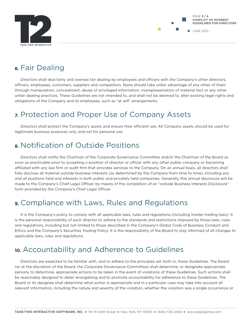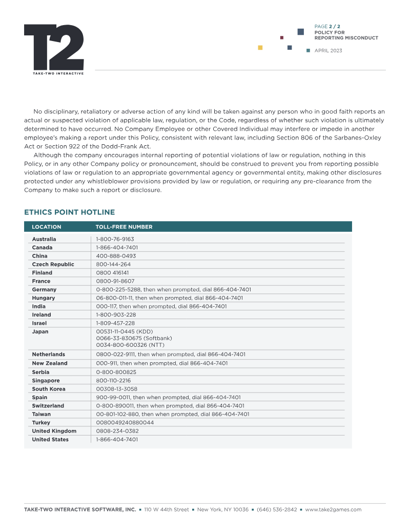 The Supplier Code of Conduct for Take-Two Interactive Software, Inc., updated in April 2023, establishes the ethical, legal, and professional standards required of all third-party partners. The primary thesis is that all suppliers, consultants, and vendors must mirror the company’s internal commitment to honesty, integrity, and human rights. This mandate extends globally to any entity providing goods or services, including distribution, marketing, and manufacturing, and requires these partners to ensure compliance among their own subcontractors and employees. The document outlines specific legal requirements across several critical domains. Suppliers must strictly adhere to competition and antitrust laws, anti-bribery and corruption statutes such as the US Foreign Corrupt Practices Act and the UK Bribery Act, and anti-money laundering regulations. Furthermore, the scope includes strict compliance with trade sanctions and export controls, specifically highlighting high-risk regions such as Iran, Cuba, Syria, North Korea, and certain areas of Ukraine. Partners are also prohibited from engaging in insider trading based on non-public information gained through their relationship with the company. Beyond legal compliance, the standards emphasize social responsibility and operational integrity. Key provisions include the prohibition of child or prison labor, the protection of fundamental human rights, and the maintenance of a work environment free from discrimination and harassment. Suppliers are required to maintain accurate financial records, protect intellectual property, and avoid conflicts of interest. To ensure adherence, the company reserves the right to conduct periodic audits and requires immediate notification of any legal investigations or violations. A global reporting infrastructure is provided, featuring a 24-hour ethics hotline available across more than twenty countries, supported by a non-retaliation policy for those reporting grievances in good faith.