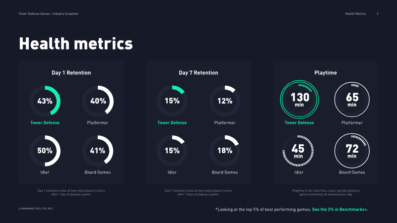 The tower defense sub-genre within the mobile arcade category demonstrated significant monetization potential and engagement depth throughout 2020. Based on an analysis of over 134,000 integrated games and 900 million unique monthly players, the sector is characterized by high-value users and strong global performance. Key financial benchmarks reveal that tower defense titles achieve an average revenue per paying user (ARPPU) of $83, significantly outperforming related genres like board games and idlers. Furthermore, the sub-genre maintains an average revenue per daily active user (ARPDAU) of $1.66 and a daily conversion rate of 3.83%, indicating a highly effective monetization funnel compared to other casual arcade segments. Geographic performance varies by metric, with European and Asian markets showing the strongest engagement. Italy leads in Day 7 retention at 39%, while France records the highest average playtime at 210 minutes. China stands out as the most effective market for monetization, boasting a conversion rate of 8.7%, nearly double that of the United States at 4.6%. These figures suggest that while Western audiences engage deeply in terms of time, Asian markets provide superior direct financial returns. The success of the genre is attributed to its accessible core mechanics, which offer immediate satisfaction and high replayability. Developers benefit from a sustainable content model where minor adjustments to characters or obstacles can shift the entire meta-game without requiring extensive new map design. The integration of meta-features such as daily challenges, cooperative modes, and PvP elements further drives player stickiness. Notable market entrants in 2020, including Kingdom Wars Defense and Rush Royale, exemplify these trends by blending traditional defense mechanics with RPG and merge elements to capture high user ratings and market share.