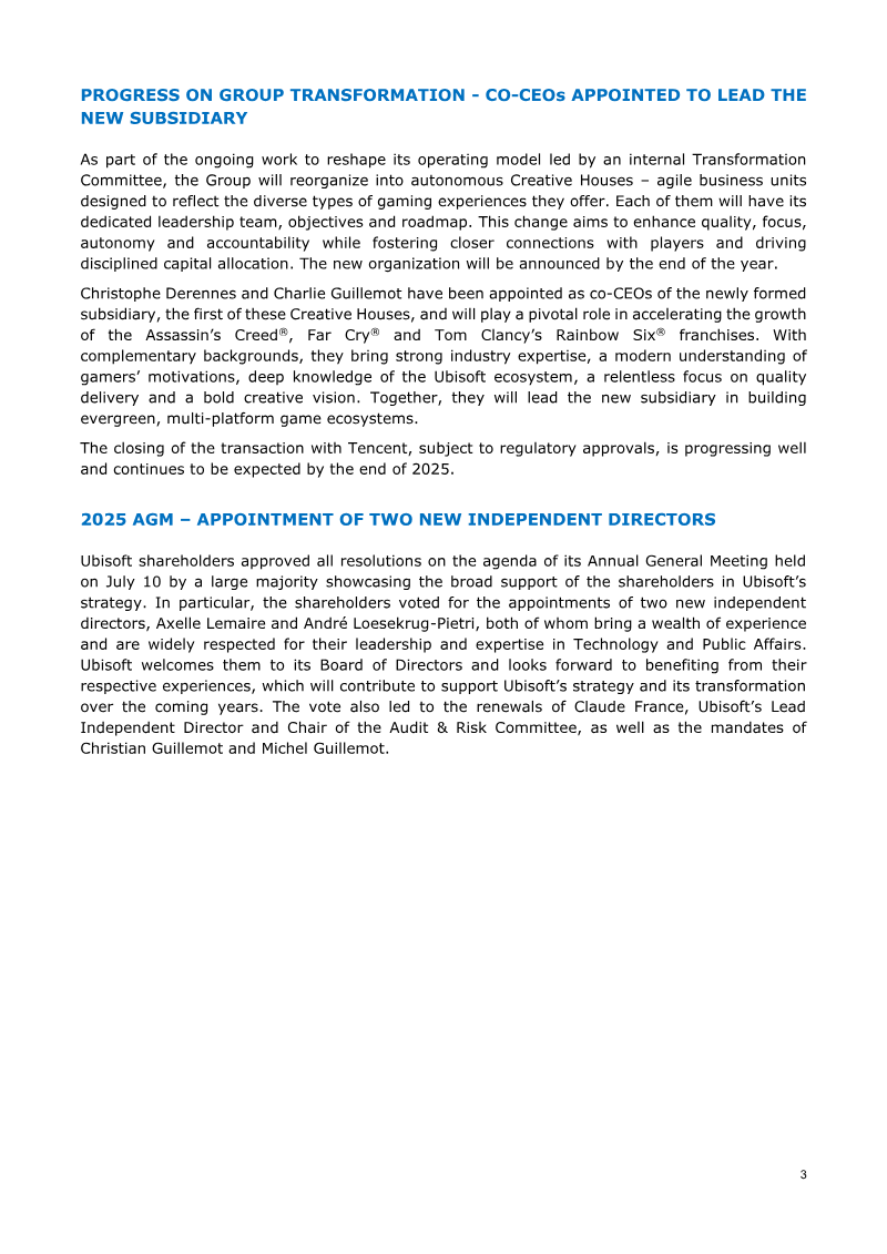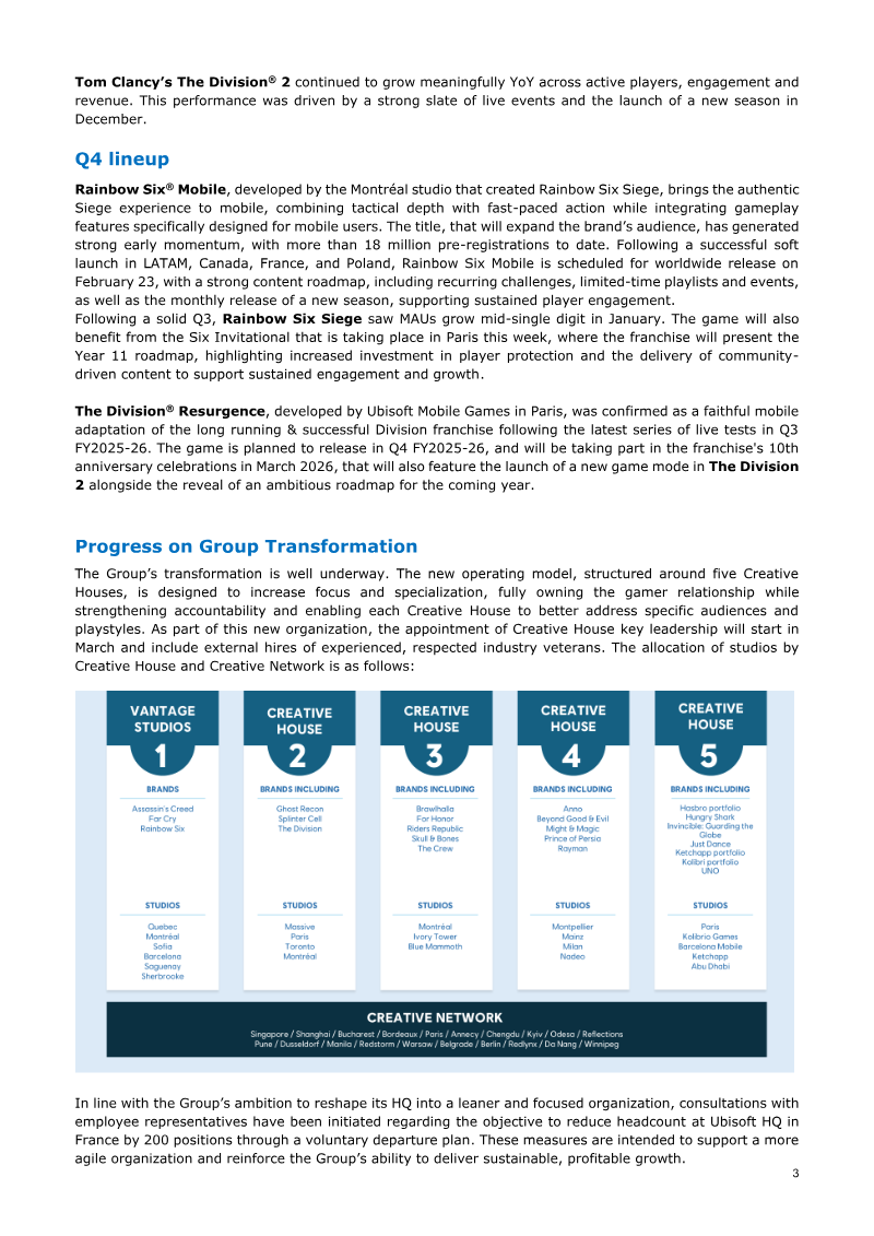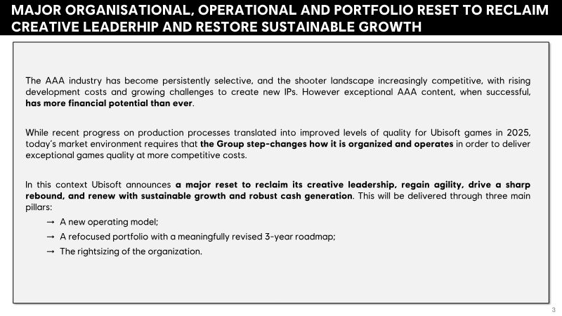 Ubisoft has announced a comprehensive organizational and portfolio reset aimed at reclaiming creative leadership and restoring sustainable growth. This strategic pivot responds to an increasingly selective AAA market, rising development costs, and a competitive landscape for shooter and live-service games. The transformation is built upon three primary pillars: a new decentralized operating model, a refocused product portfolio, and an accelerated cost-reduction program designed to rightsize the company for long-term efficiency. The centerpiece of this reset is the establishment of five specialized Creative Houses, which will operate as integrated business units with full financial and creative ownership over specific genres. These units include Vantage Studios, focused on flagship franchises like Assassin’s Creed and Far Cry; a house for competitive shooters; one for live-service experiences; a division for immersive fantasy and narrative universes; and a final house dedicated to casual and family-friendly titles. This structure is supported by a centralized Creative Network for production capacity and a Core Services division providing shared technology, including increased investment in generative AI. To bolster collaboration, the company is also mandating a return to five days per week on-site for all teams. The portfolio reset involves the discontinuation of six games, including the Prince of Persia: The Sands of Time remake, and the delay of seven other titles to ensure they meet higher quality benchmarks. These changes have led to a significant revision of financial outlooks for fiscal years 2026 and 2027. For FY2026, Ubisoft expects net bookings of approximately €1.5 billion and a non-IFRS EBIT loss of around €1 billion, largely due to a €650 million one-off accelerated depreciation. To mitigate these impacts, the company is accelerating its cost-saving initiatives, targeting a total fixed cost reduction of €500 million since FY2023, with the goal of reaching a run-rate of €1.25 billion in total fixed costs by March 2028.