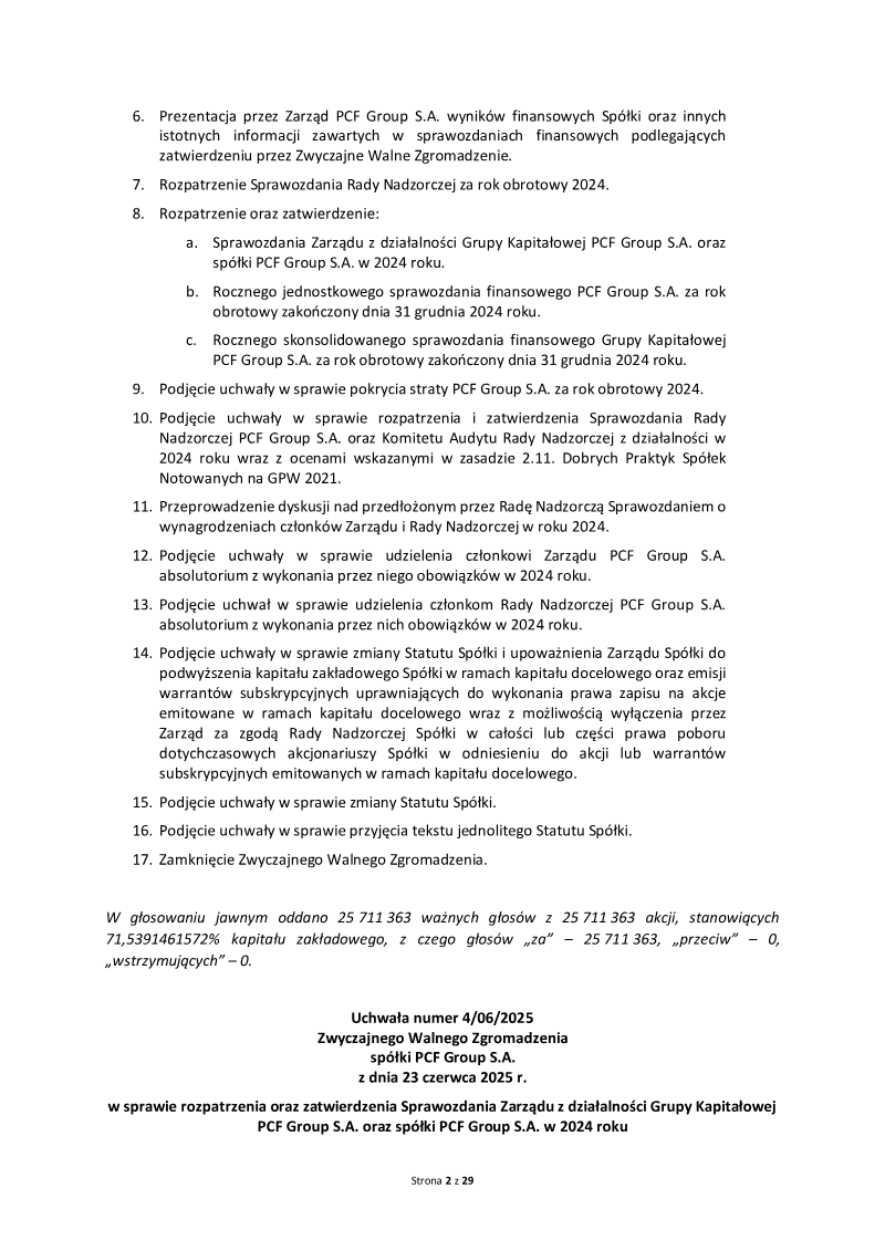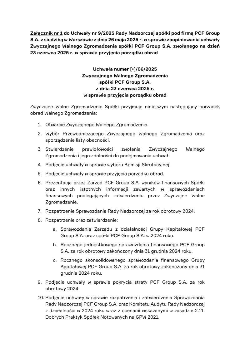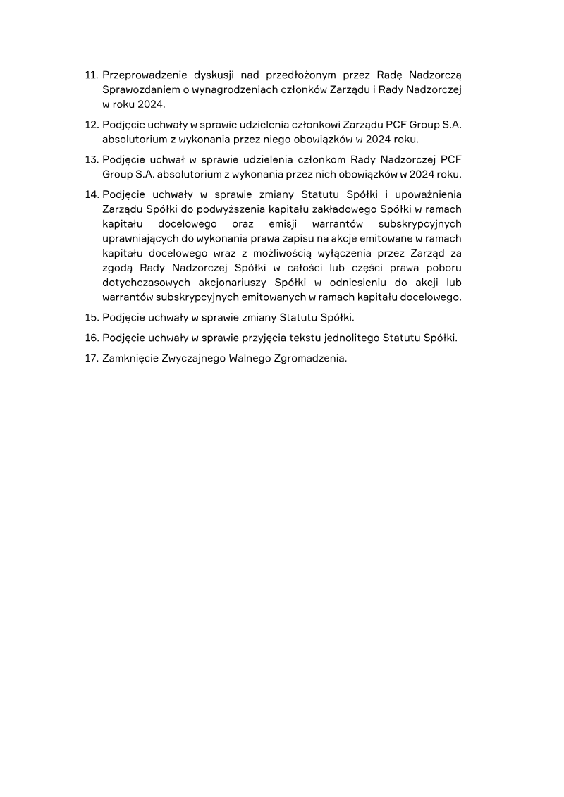 The amendment introduces a new provision authorising the Management Board to raise the share capital by up to 215 641,62 zł, corresponding to a maximum issue of 10 782 081 ordinary bearer shares with a nominal value of 0,02 zł each. The authorisation is limited to three years from the registration of the amendment and includes the possibility of issuing subscription warrants for the same number of shares, with the exercise deadline coinciding with the expiry of the authorisation. Shares issued under this “target capital” may be paid for in cash or in‑kind and will participate in dividends according to the timing of their registration on the securities account, as detailed in two specific dividend‑eligibility rules. The amendment also restructures the governance framework. The Management Board may now consist of one or more members, with the Supervisory Board determining its size; members serve a common three‑year term and are appointed and dismissed by the Supervisory Board. Decision‑making within the Board requires a simple majority, while a tie is resolved by the President’s vote. Remuneration for Board members is set by Supervisory Board resolution, and additional compensation may be granted for consulting services related to game development. The Board may grant only joint powers of attorney, which require unanimous consent, and any issuance of shares or warrants must receive Supervisory Board approval for pricing decisions. Further changes affect the Supervisory Board, expanding its composition to five‑seven members appointed by the General Meeting and introducing a mandatory audit committee whenever the company is classified as a public interest entity. The audit committee must comprise at least three members, the majority of whom must meet independence criteria. A co‑optation mechanism is added to allow the Supervisory Board to fill vacancies temporarily, with the General Meeting required to confirm co‑opted members within thirty days. Overall, the statutory revisions aim to provide the company with flexible capital‑raising tools, clarify dividend rights for newly issued shares, and modernise corporate governance by defining board structures, voting procedures, remuneration, and audit oversight. The scope is limited to PCF Group S.A., a Polish joint‑stock company, and the changes become effective upon registration in the National Court Register.