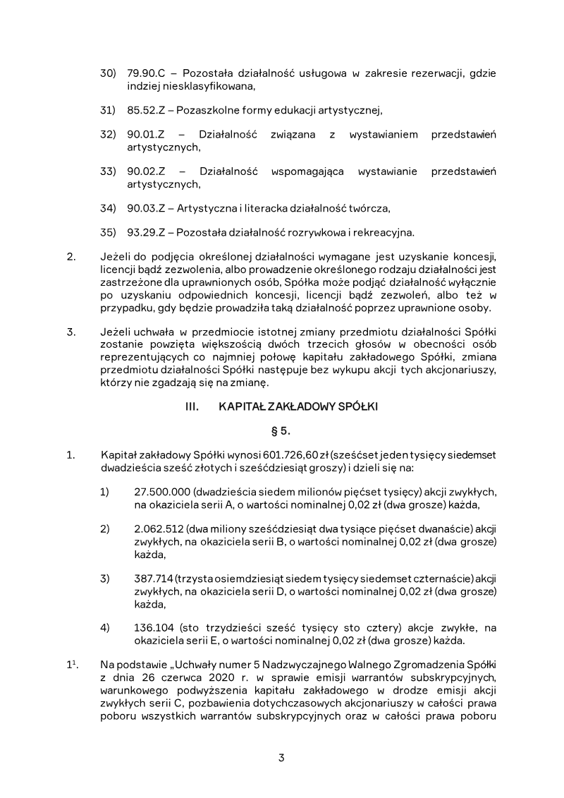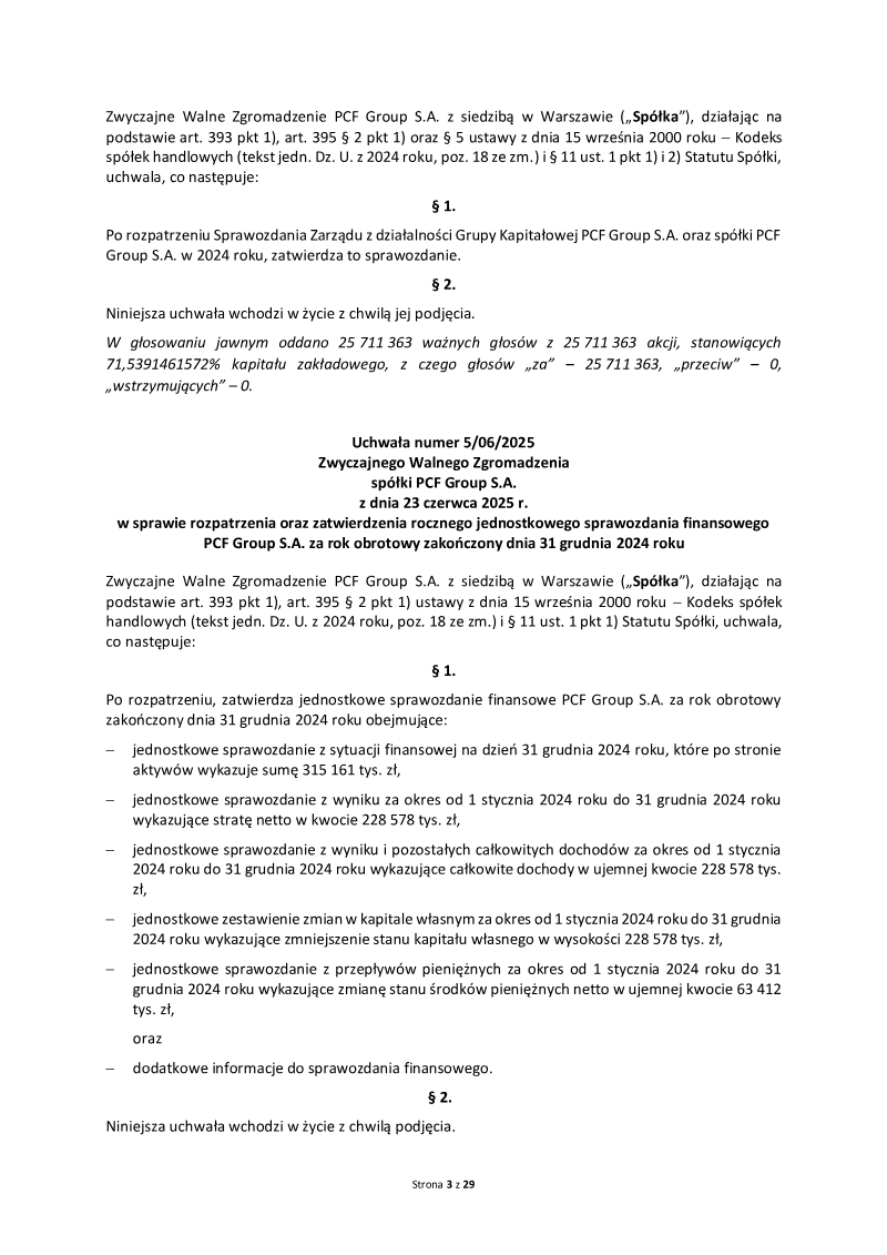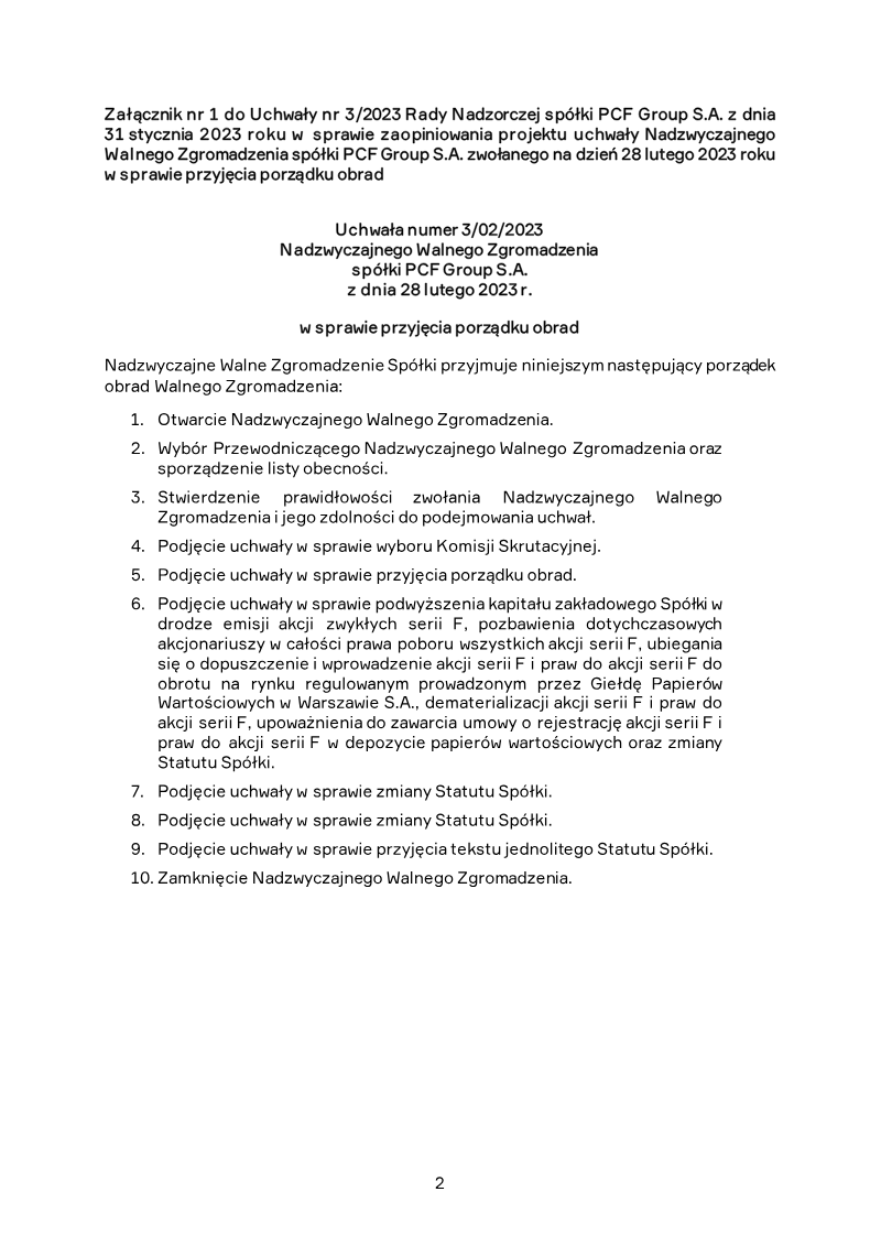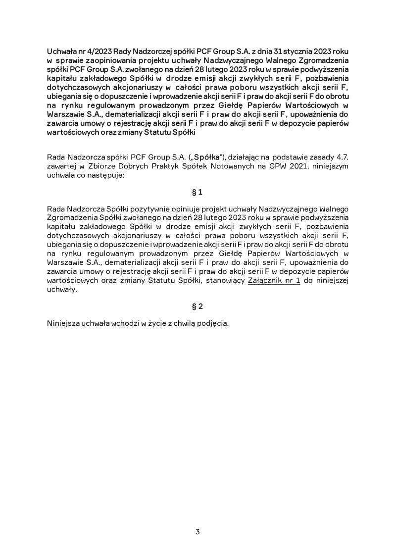 The amendment introduces a new provision authorising the Management Board to raise the share capital by up to 215 641,62 zł, corresponding to a maximum issue of 10 782 081 ordinary bearer shares with a nominal value of 0,02 zł each. The authorisation is limited to three years from the registration of the amendment and includes the possibility of issuing subscription warrants for the same number of shares, with the exercise deadline coinciding with the expiry of the authorisation. Shares issued under this “target capital” may be paid for in cash or in‑kind and will participate in dividends according to the timing of their registration on the securities account, as detailed in two specific dividend‑eligibility rules. The amendment also restructures the governance framework. The Management Board may now consist of one or more members, with the Supervisory Board determining its size; members serve a common three‑year term and are appointed and dismissed by the Supervisory Board. Decision‑making within the Board requires a simple majority, while a tie is resolved by the President’s vote. Remuneration for Board members is set by Supervisory Board resolution, and additional compensation may be granted for consulting services related to game development. The Board may grant only joint powers of attorney, which require unanimous consent, and any issuance of shares or warrants must receive Supervisory Board approval for pricing decisions. Further changes affect the Supervisory Board, expanding its composition to five‑seven members appointed by the General Meeting and introducing a mandatory audit committee whenever the company is classified as a public interest entity. The audit committee must comprise at least three members, the majority of whom must meet independence criteria. A co‑optation mechanism is added to allow the Supervisory Board to fill vacancies temporarily, with the General Meeting required to confirm co‑opted members within thirty days. Overall, the statutory revisions aim to provide the company with flexible capital‑raising tools, clarify dividend rights for newly issued shares, and modernise corporate governance by defining board structures, voting procedures, remuneration, and audit oversight. The scope is limited to PCF Group S.A., a Polish joint‑stock company, and the changes become effective upon registration in the National Court Register.