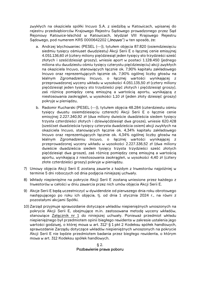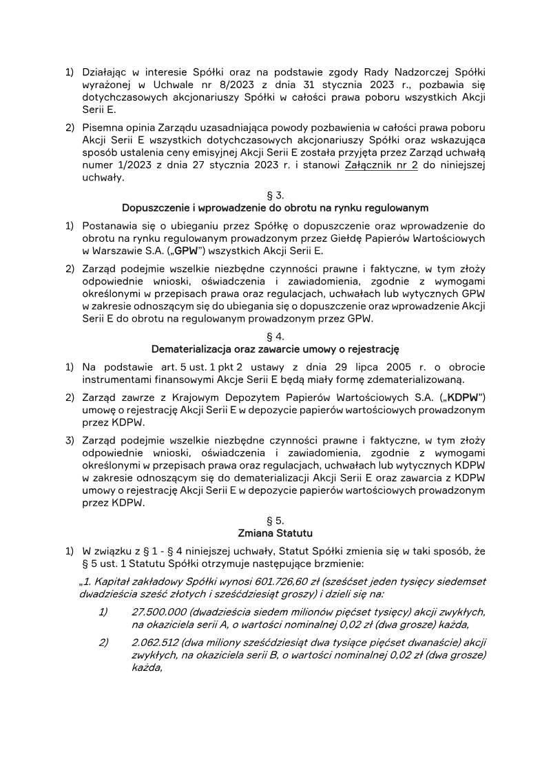 **Summary of the Board Resolution (Uchwała nr 19/2025) of PCF Group S.A. – 12 August 2025** | Topic | Key points | |-------|-------------| | **Purpose of the resolution** | Increase the company’s share capital, issue a new series of ordinary bearer shares (Series H), set the issue price and subscription deadline, strip existing shareholders of pre‑emptive rights on these shares, seek admission of the new shares to trading on the Warsaw Stock Exchange, arrange dematerialisation, and amend the Articles of Association. | | **Capital increase** | • Current share capital is raised by **PLN 133 400,00** to a total of **PLN 852 205,42**.<br>• The increase is effected by issuing **6 670 000** new ordinary bearer shares of **Series H** (nominal value **PLN 0,02** each). | | **Issuance method** | • Private placement (sub‑subscription) under Art. 431 § 2 (1) KSH, but **exempt from the prospectus requirement** under EU Prospectus Regulation (Regulation 2017/1129).<br>• The public offer is limited to **Poland only**; the shares may be offered **ex‑US** (i.e., only in offshore transactions outside the United States) under **U.S. Regulation S** or other registration exemptions. | | **Issue price** | **PLN 3,00** per Series H share (determined after a demand‑book building process conducted 6‑11 August 2025). | | **Subscription deadline** | The company must conclude subscription agreements for the 6 670 000 Series H shares **by 14 August 2025**. | | **Dividend rights** | • If the shares are first entered in the securities account **on or before** the dividend record date set by the General Meeting, they will participate in the dividend **starting from the previous fiscal year** (i.e., from 1 January of the year preceding the year of entry).<br>• If entered **after** the dividend record date, they will participate **starting from the fiscal year in which they are entered** (i.e., from 1 January of that year). | | **Payment & rights** | • Shares can be paid **only with cash**.<br>• They are ordinary bearer shares **without any special rights** (e.g., no voting or preferential rights beyond those of ordinary shares). | | **Pre‑emptive rights** | All existing shareholders are **fully stripped of pre‑emptive rights** to subscribe to the Series H shares (approved by the Supervisory Board in resolution 16/2025). | | **Admission to trading** | The board will apply for **admission of Series H shares to the regulated market of the Warsaw Stock Exchange (WSE)**, where the company’s existing shares are already listed. | | **Dematerialisation** | • Series H shares will be **dematerialised** in accordance with the Polish Act