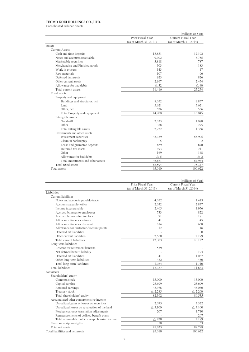 Financial highlights for the fiscal year ending March 2014 demonstrate a solid growth trajectory for Tecmo Koei Holdings. Net sales increased by 8.5 % to ¥37,576 million, driven primarily by a 7.3 % rise in Game Software sales and a notable 17.2 % jump in Online & Mobile revenue, while Media & Rights grew 19 %. Operating income expanded 15.0 % to ¥7,140 million; the Online & Mobile segment alone contributed a 95.3 % surge in operating profit, offsetting modest declines in Game Software and Amusement Facilities. Profitability metrics improved markedly: income before taxes rose 21.8 % to ¥10,691 million and net income climbed 22.6 % to ¥6,936 million. Gross profit margin widened from 40.2 % in FY2012 to 43.0 % in FY2013, reflecting efficient cost management across segments. Balance‑sheet strength is evident. Total assets grew 5.9 % to ¥100,622 million, largely due to a jump in investment securities and property & equipment. Current assets fell 19 % as cash and marketable securities were reduced, yet liquidity remained robust with current assets still exceeding current liabilities. Shareholders’ equity increased 5.4 % to ¥86,535 million, supported by retained earnings growth and a modest reduction in treasury stock. The data cover the Japanese market for FY2013, with segmental performance broken down by product lines. Figures are presented in millions of yen and reflect consolidated financial statements, providing a comprehensive view of the company’s operational and financial health during the period.