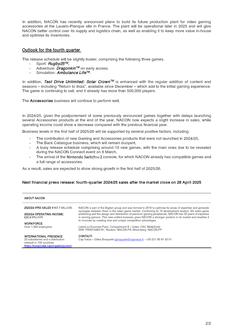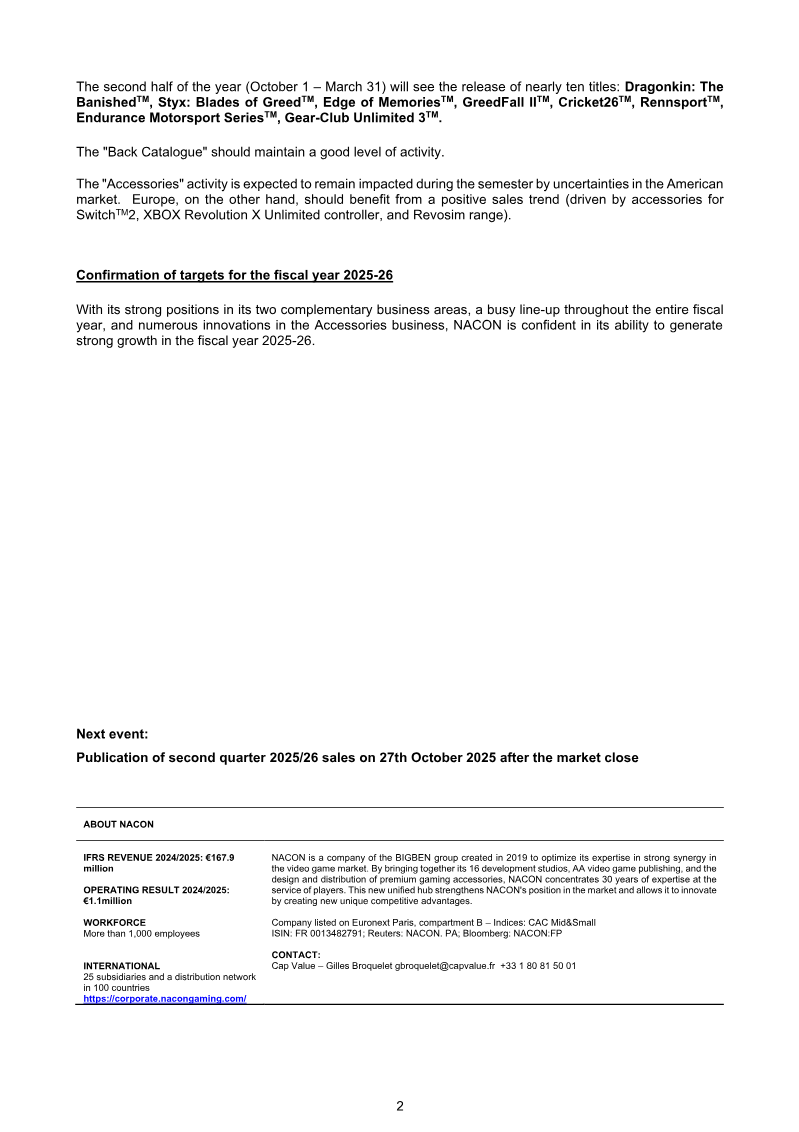 Nacon reported consolidated revenue of €31.3 million for the first quarter of fiscal 2025‑26 (April 1–June 30), a slight decline of 2.9 % compared with the €32.3 million recorded in the same period of 2024‑25. Gaming sales, however, grew by 10.4 % to €19.7 million, driven largely by a 46.4 % jump in catalogue sales to €5.6 million, with key titles such as *Tour de France 2025* and *Pro Cycling Manager 25* contributing 25 % and 35 % sales increases respectively. Back‑catalogue performance remained flat at €14.0 million, meeting expectations. Accessories revenue fell to €10.8 million, a 18.8 % drop largely attributed to a weaker U.S. market and unfavorable year‑on‑year comparison, though European sales showed 22 % growth thanks to Nintendo Switch 2 and XBOX Revolution X Unlimited controller launches. Other revenue, including mobile and audio, decreased by 25.9 % to €0.8 million. The company anticipates robust second‑quarter growth, citing new releases such as *Rugby League 26* and *Robocop: Rogue City – Unfinished Business*, with additional titles slated for the second half of the year. Nacon maintains confidence in meeting its 2025‑26 fiscal targets, citing a strong dual‑business model and ongoing accessory innovation. The next quarterly update is scheduled for 27 October 2025.