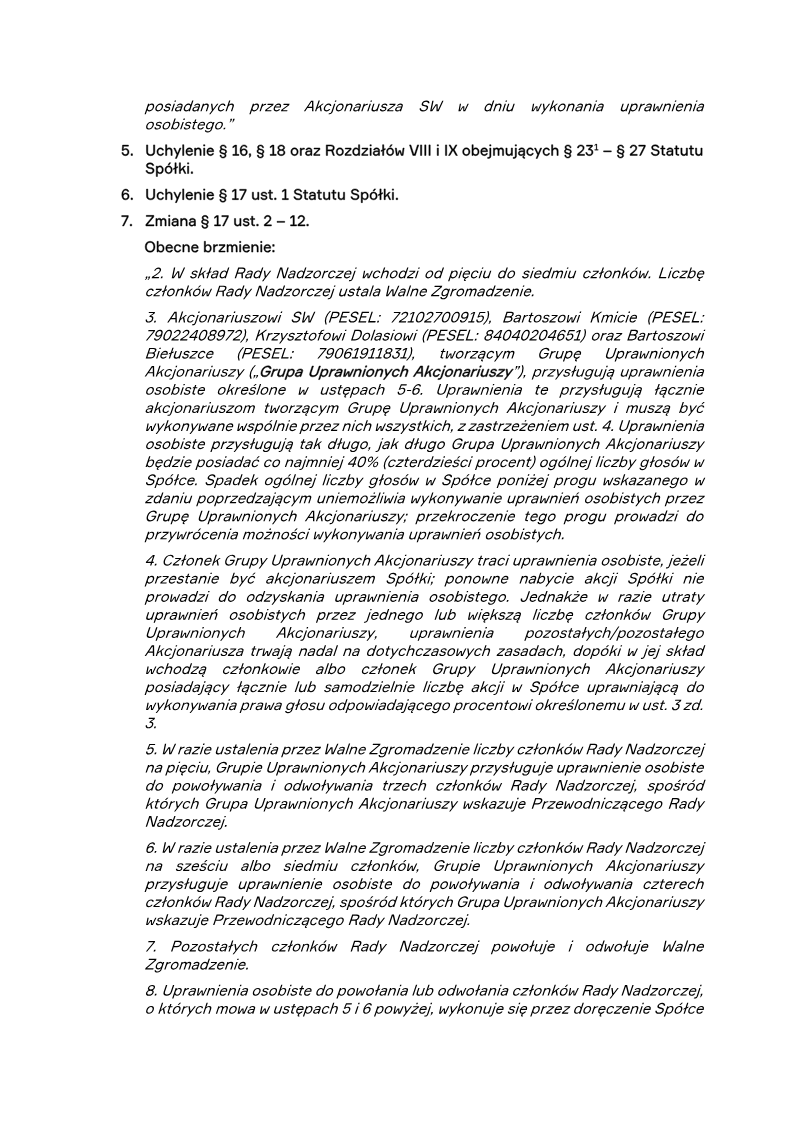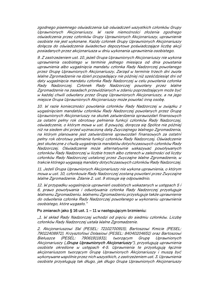The proposed amendments to the statutes of PCF Group S.A., a Warsaw‑based company, aim to revise capital structure limits, governance provisions, and audit committee requirements. Capital changes set a minimum of PLN 599,004.54 and a maximum of PLN 715,810.38 for the share capital, while maintaining existing share series A (27,500,000 shares), B (2,062,512 shares), D (387,714 shares) and adding a new series F with a range of 1 to 5,853,941 shares. The amendments eliminate several statutory paragraphs (e.g., § 5 6, § 1, §§ 16, 18, and chapters VIII‑IX) and modify others to streamline shareholder rights. Key governance adjustments introduce a “Group of Qualified Shareholders” comprising four named individuals, granting them collective personal rights to appoint or dismiss board members. The group’s authority depends on holding at least 40 % of voting rights and is exercised through joint written declarations accompanied by deposit certificates. If the group fails to act within a month, the board may be appointed by ordinary shareholders; if the group’s rights lapse, ordinary shareholders regain full appointment powers. The amendments also refine board composition rules, allowing five to seven members and specifying the number of directors the group can influence based on board size. Audit and supervisory provisions are tightened to align with public interest entity standards. The company must maintain at least two independent board members and, upon admission to a regulated market, establish an audit committee with a majority of independent members. These changes ensure compliance with Polish public‑interest entity regulations and enhance shareholder influence over board composition while clarifying audit oversight responsibilities.