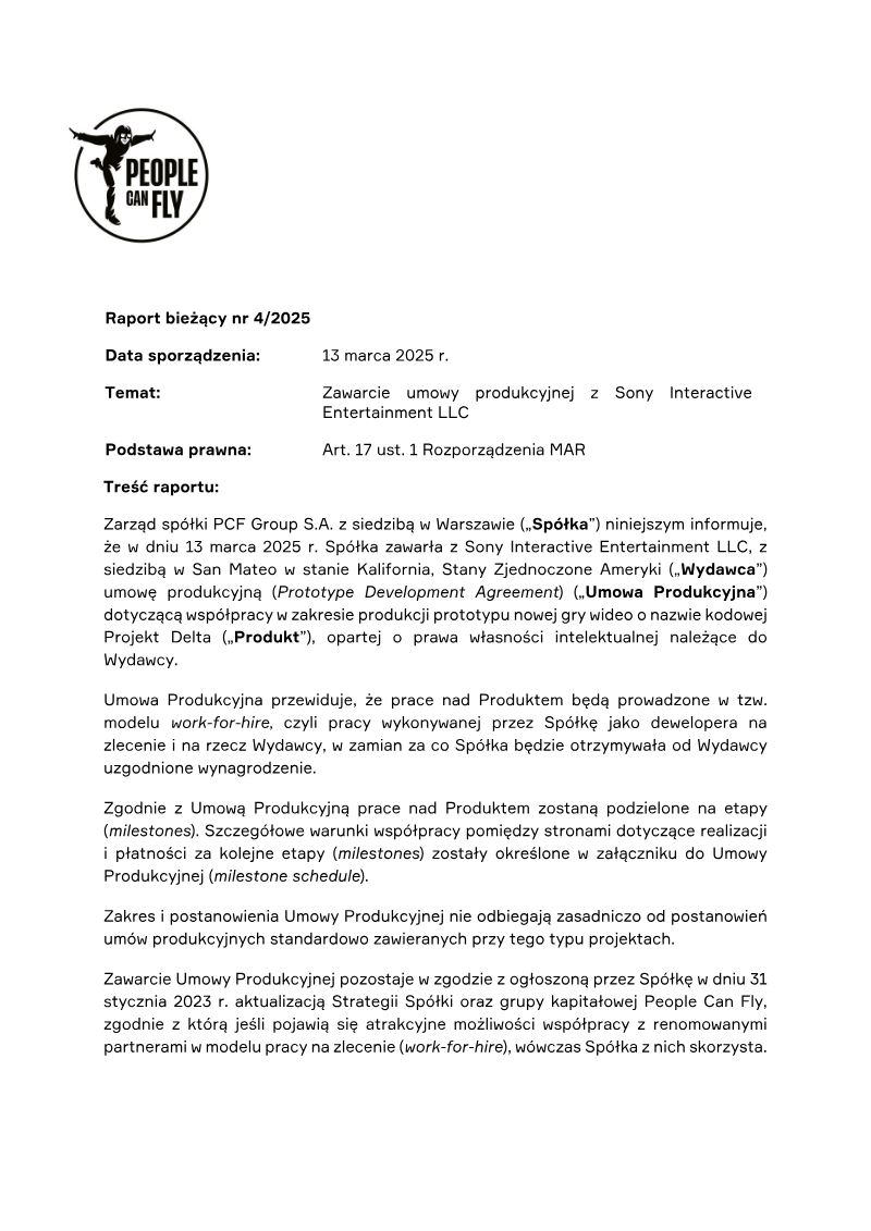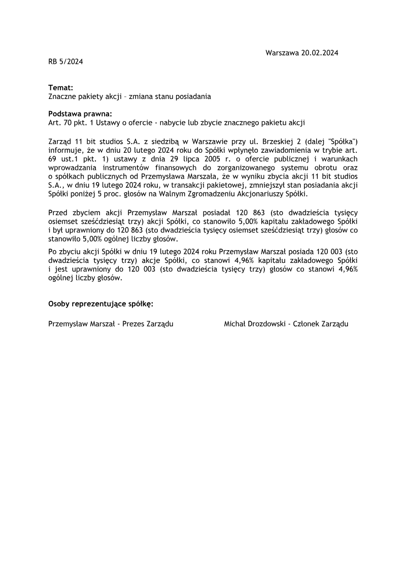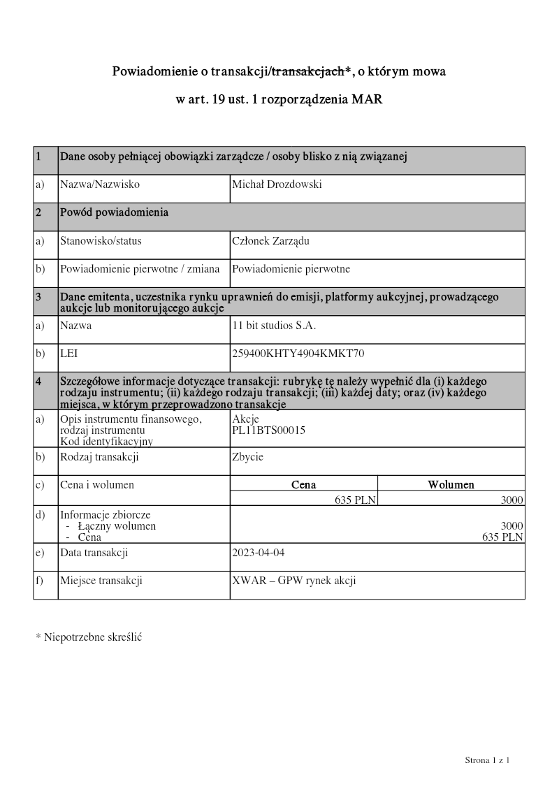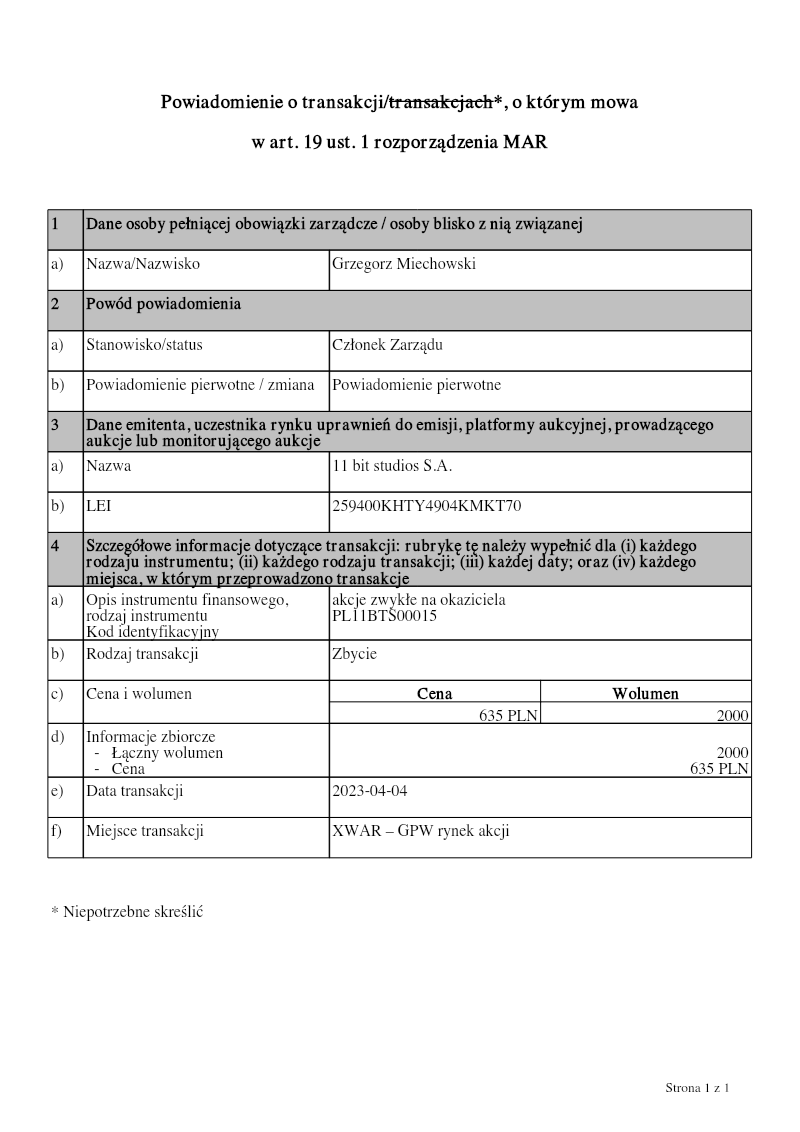 The notification reports a transaction involving Grzegorz Miechowski, who holds the position of board member at 11 bit studios S.A. The filing is made under Article 19(1) of the MAR regulation, indicating a primary notification for a sale transaction. The issuer and market participant is 11 bit studios S.A., identified by LEI 259400KHTY4904KMKT70. The transaction concerns ordinary bearer shares of the issuer, classified as instrument PL11BTS00015. The sale was executed on 4 April 2023 at the Warsaw Stock Exchange (XWAR) in the equities market. A total of 2 000 shares were sold at a price of 635 PLN each, resulting in a gross transaction value of 1 270 000 PLN. The notification provides both detailed and aggregate information: the instrument description, transaction type (sale), price, volume, total volume, and transaction date. No additional transactions or changes are reported in this filing. The scope of the notification is limited to a single transaction on a specific date and venue, covering only ordinary shares of 11 bit studios S.A. The data are presented in compliance with MAR requirements, ensuring transparency for market participants and regulators regarding the sale by a senior executive.