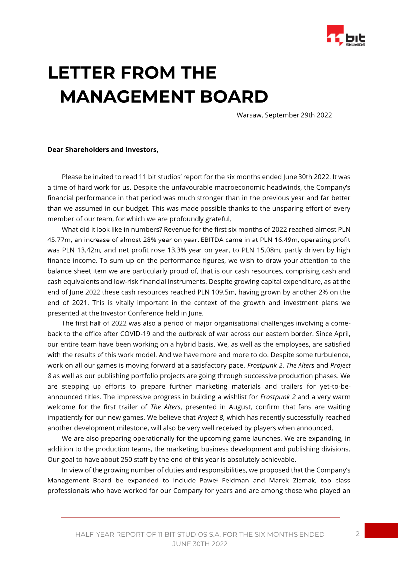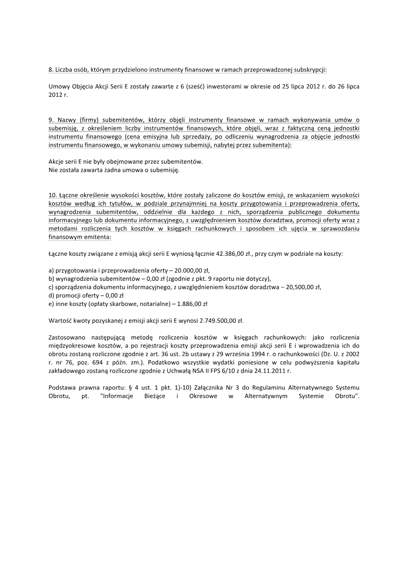 The report details the completion of a private subscription for Series E ordinary shares issued by 11 bit studios S.A. following the board’s resolution on 22 June 2012 to increase share capital without existing shareholders’ subscription rights. The subscription commenced on the resolution date and concluded on 27 July 2012, with the board filing a capital declaration on 31 July 2012. Six private investors entered into purchase agreements between 25 and 26 July 2012, acquiring a total of 305,500 shares at an issue price of PLN 9.00 per share, generating proceeds of PLN 2,749,500. The subscription involved no reduction in nominal value and did not include any sub‑subscription agreements. The total number of shares offered was 400,000, but only 305,500 were ultimately subscribed. Costs associated with the issuance amounted to PLN 42,386, broken down into preparation and execution of the offer (PLN 20,000), informational document drafting and advisory fees (PLN 20,500), notarial and treasury charges (PLN 1,886), with no sub‑subscription or promotion expenses. These costs were recorded as interim expenses and will be capitalised in accordance with Polish accounting regulations. The report confirms that the Series E shares were issued privately, without a public allocation date, and outlines the legal basis for reporting under the Alternative Trading System regulations. The capital increase was fully executed within the stipulated period, and all financial and procedural details comply with applicable corporate law provisions.