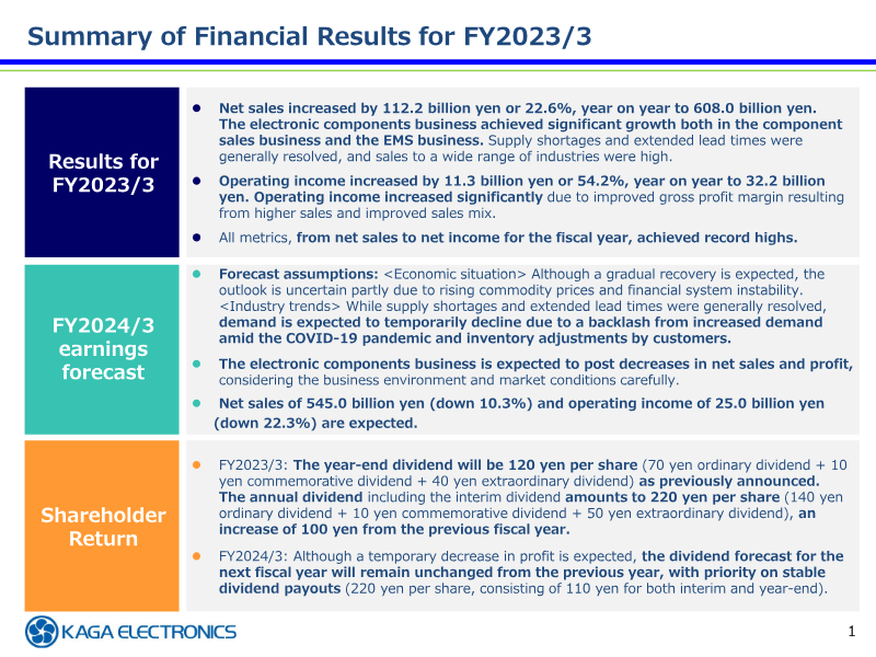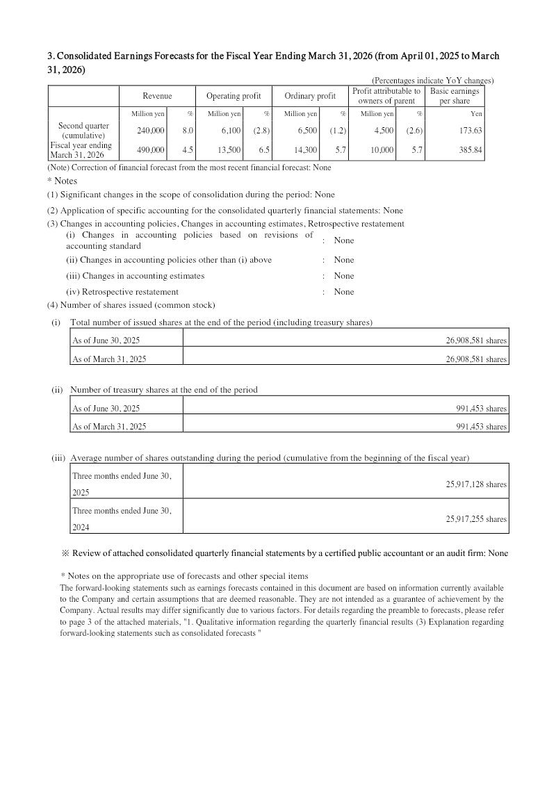 The consolidated financial results for the three months ending June 30, 2025, reflect a period of growth for Matsuda Sangyo Co., Ltd. amid a moderately recovering Japanese economy. The primary objective of this report is to detail the company’s financial performance and operational status across its two core segments: precious metals-related business and food-related business. The company maintains a positive outlook, reporting significant year-over-year increases in both revenue and profitability, while confirming that its previously announced earnings forecasts for the full fiscal year ending March 31, 2026, remain unchanged. Key financial metrics for the first quarter show net sales of 146,627 million yen, representing a 31.2% increase compared to the same period in the previous year. Operating profit rose by 19.7% to 3,743 million yen, while profit attributable to owners of the parent grew by 16.8% to 3,012 million yen. The precious metals segment benefited from increased recycling volumes and rising gold prices, alongside strong demand from the generative AI and data center sectors, contributing 115,526 million yen in revenue. The food-related business also performed well, achieving 31,112 million yen in revenue, supported by robust inbound demand and effective price adjustments to offset rising logistics and raw material costs. The company’s financial position remains stable, with total assets reaching 173,703 million yen as of June 30, 2025, and an equity-to-total-assets ratio of 58.3%. Cash flows from operating activities improved significantly, providing 181 million yen compared to a 4,783 million yen outflow in the prior year’s corresponding quarter. The results were prepared in accordance with Japanese GAAP, covering the company’s consolidated operations for the three-month period ending June 30, 2025.