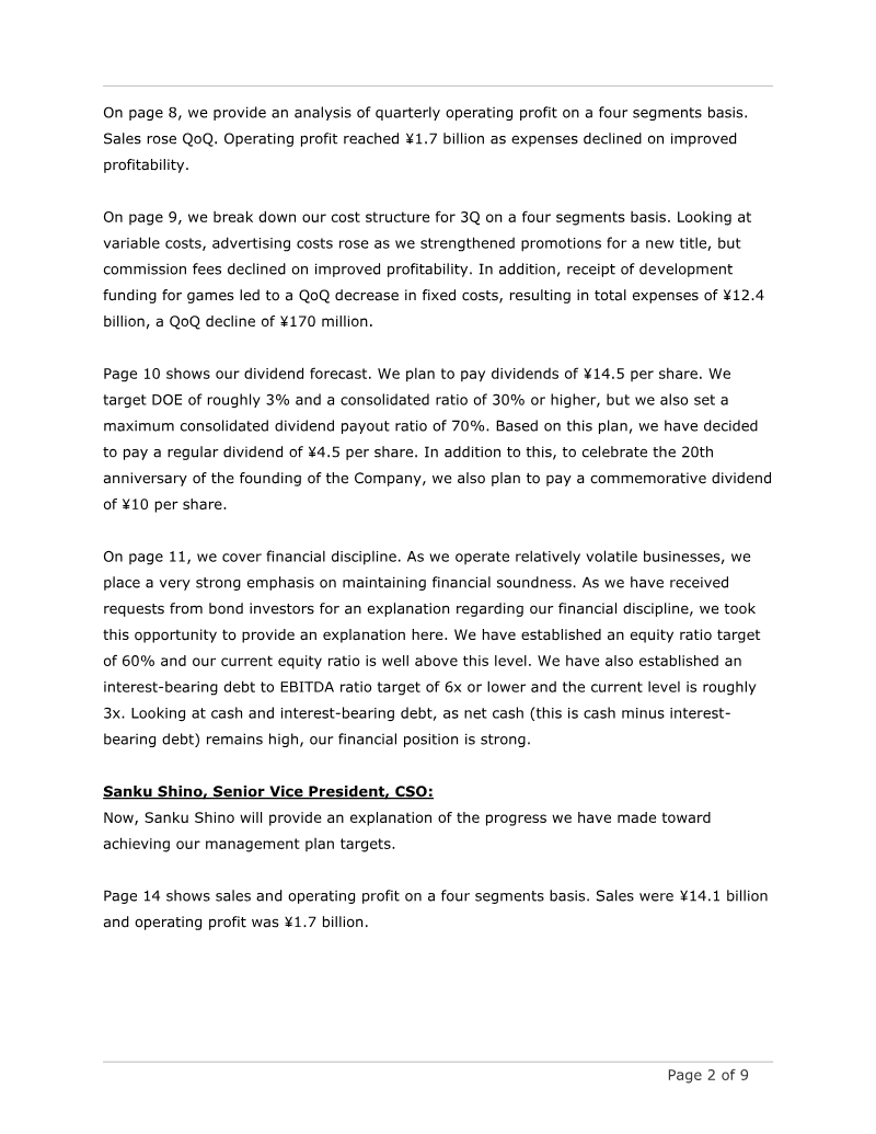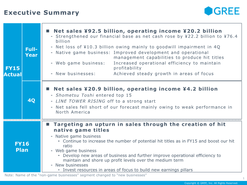 FY2015 Fourth Quarter Financial Results & Net sales ¥92.5 billion, operating income ¥20.2 billion ⁃ Strengthened our financial base as ne t cash rose by ¥22.2 billion to ¥76.4 Full- ⁃ Net loss of ¥10.3 billion owing mainly to goodwill impairment in 4Q Year ⁃ Native game business: Improved development and operational management capabilities to produce hit titles ⁃ Web game business: Increased operational efficiency to maintain FY15 ...
