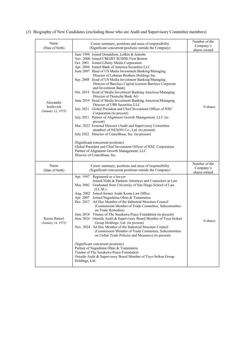 NEXON Co., Ltd. announced the Board’s selection of candidates for its 24th Annual General Meeting on March 25, 2026. The slate includes six directors, among them two new outside directors and three individuals who will serve concurrently on the Audit and Supervisory Committee. Current executives Junghun Lee, Shiro Uemura, Patrick Söderlund and Daehyun Kang are retained. New appointments comprise Alexander Iosilevich, a seasoned investment‑banking executive with no shareholding in NEXON, and Kaoru Hattori, a Japanese lawyer and partner at Nagashima Ohno & Tsunematsu who also holds trustee and board roles in Toyo Seikan Group Holdings. The Audit and Supervisory Committee will be strengthened by Shiro Kuniya, Naoya Tsurumi—an experienced Sega executive with extensive leadership roles across SEGA subsidiaries—and Hanmin Cho, a private‑equity professional who has led investment divisions at NXC Corporation and holds directorships in NXMH B.V. and Bitstamp Limited. The announcement details each candidate’s career trajectory, concurrent positions, and share ownership (all new candidates hold zero shares). The selection aligns with Korean Companies Act provisions for outside directors and reflects NEXON’s strategy to blend internal leadership continuity with external expertise in finance, gaming operations, and regulatory oversight. The candidates’ diverse backgrounds—spanning global investment banking, legal practice, gaming industry leadership, and private‑equity management—are intended to enhance governance, strategic direction, and risk oversight for the company’s operations in South Korea and its international markets.