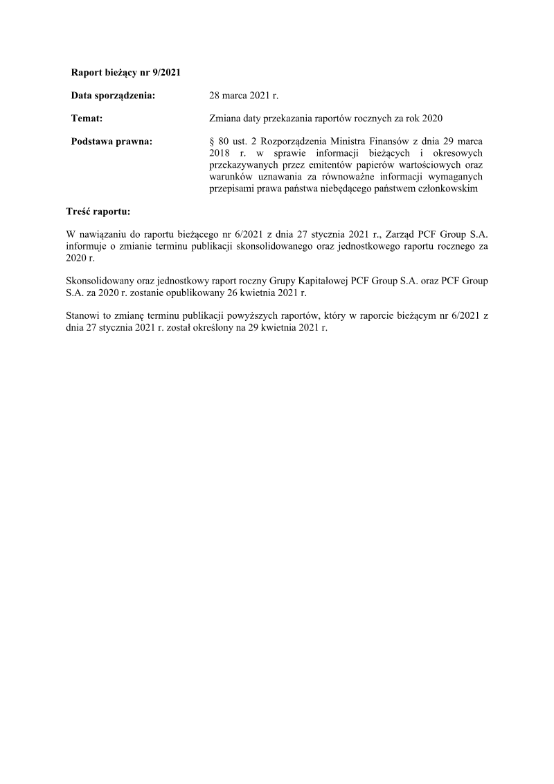 The report announces a revision of the publication date for PCF Group S.A.’s consolidated and individual annual reports covering 2020. The change follows a prior interim report issued on 27 January 2021, which had set the release for 29 April 2021. The new schedule moves the publication forward to 26 April 2021, allowing stakeholders to receive financial statements earlier. The adjustment is grounded in § 80(2) of the Minister of Finance regulation dated 29 March 2018, which governs the timing and equivalence of information provided by securities issuers. The announcement is issued by the Board of PCF Group S.A., confirming that both the group’s consolidated report and the individual entity’s annual report will adhere to the updated deadline. No additional data, statistics, or broader industry context are provided; the focus remains solely on the procedural update. The scope is limited to PCF Group S.A. and its reporting obligations for the fiscal year 2020, with no mention of geographic expansion or comparative analysis. The methodology is implicit in regulatory compliance rather than empirical research, and the communication serves to inform investors, regulators, and other interested parties of the revised timeline.
