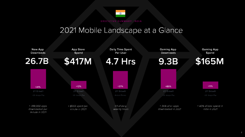 In 2021, the most downloaded and highest‑spending apps in India included Google Pay, Instagram, Flipkart, Jio MyJio and Hotstar. In gaming, Free Fire (Tencent), Call of Duty: Mobile (Activision Blizzard) and Gardenscapes – New Acres (Playrix) led downloads, with Free Fire and Call of Duty: Mobile also topping spend charts. These figures underscore India’s status as a leading mobile market across diverse verticals and user segments.
