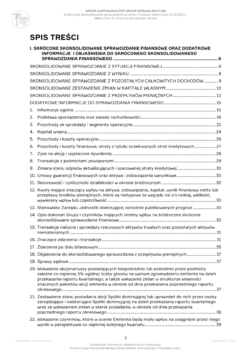 The presentation reports PCF Group S.A.’s financial performance for the first half of 2023, covering operations across its global studio network and publishing activities. Revenue rose to PLN 90.6 million in 1H 2023, up from PLN 68.7 million in the same period of 2022, driven primarily by a new contract with Take Two Interactive and the launch of the VR title “Green Hell.” Operating income (EBIT) reached PLN 29.0 million, a significant improvement over the prior year’s negative EBIT of PLN 13.1 million, reflecting higher scale and a 16 % increase in the workforce from 29.7 k to 34.5 k employees by June 30, 2023. The group’s balance sheet shows total assets of PLN 481.9 million at 30 June 2023, up from PLN 350.8 million in December 2022, with equity strengthening to PLN 277.6 million. Cash and cash equivalents increased by PLN 235.3 million, largely due to a secondary public offering (SPO) that raised PLN 235.3 million at an issue price of PLN 40.20 per share. Key shareholders include Krafton Inc., which invested PLN 144.5 million and secured preferential rights for future publishing agreements. Portfolio highlights include the self‑publishing titles “Maverick,” “Gemini,” and “Dagger,” with projected releases in 2025‑26, and the VR project “Green Bulletstorm” slated for a 14 December 2023 launch. The company projects continued growth in both development and publishing segments, with a focus on expanding its VR footprint and leveraging strategic partnerships for upcoming releases.