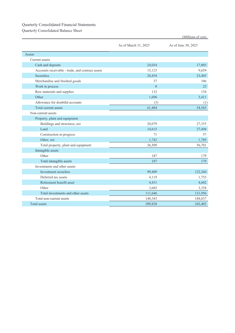 The quarterly consolidated financial results for Koei Tecmo Holdings Co., Ltd. covering April 1 to June 30, 2025 show a sharp decline in operating performance compared with the same period in 2024. Net sales fell by 15.9 % to ¥14,800 million from ¥17,607 million, while operating profit dropped 37.5 % to ¥3,574 million from ¥5,723 million. Ordinary profit and profit attributable to owners of parent fell 53.1 % and 55.5 %, respectively, reaching ¥8,769 million and ¥6,072 million. Comprehensive income for the quarter was ¥16,495 million, a 14.1 % decrease from ¥19,202 million in the prior year. Total assets increased to ¥243,402 million from ¥209,828 million, driven mainly by higher property, plant and equipment and investment securities. Net assets contracted slightly to ¥187,119 million from ¥189,421 million, lowering the capital adequacy ratio to 76.5 % from 89.9 %. Shareholders’ equity fell to ¥175,579 million due largely to a decline in retained earnings. The company forecasts continued weakness for the fiscal year ending March 31, 2026. Six‑month net sales are projected to decline 14.8 % to ¥92,000 million, with operating profit expected to fall 53.1 % to ¥50,000 million and ordinary profit down 61.9 % to ¥80,000 million. Dividend policy remains unchanged, with a forecast of ¥43 million for the year ending March 31, 2026. Methodologically, the report follows Japanese GAAP and includes no changes in consolidation scope or accounting policy. The financial statements are presented in yen, with figures rounded to the nearest million.