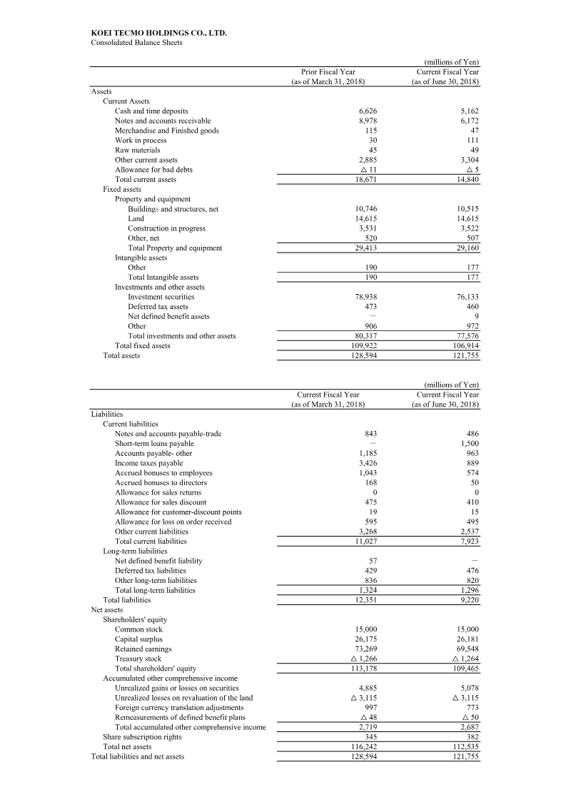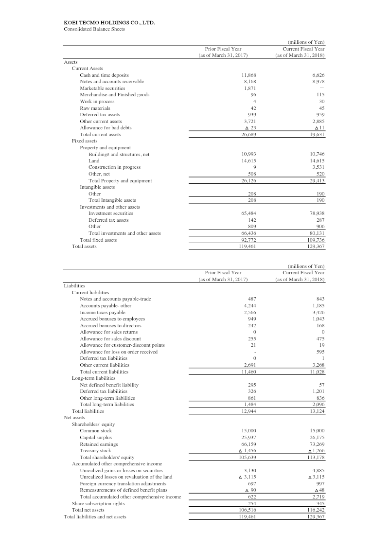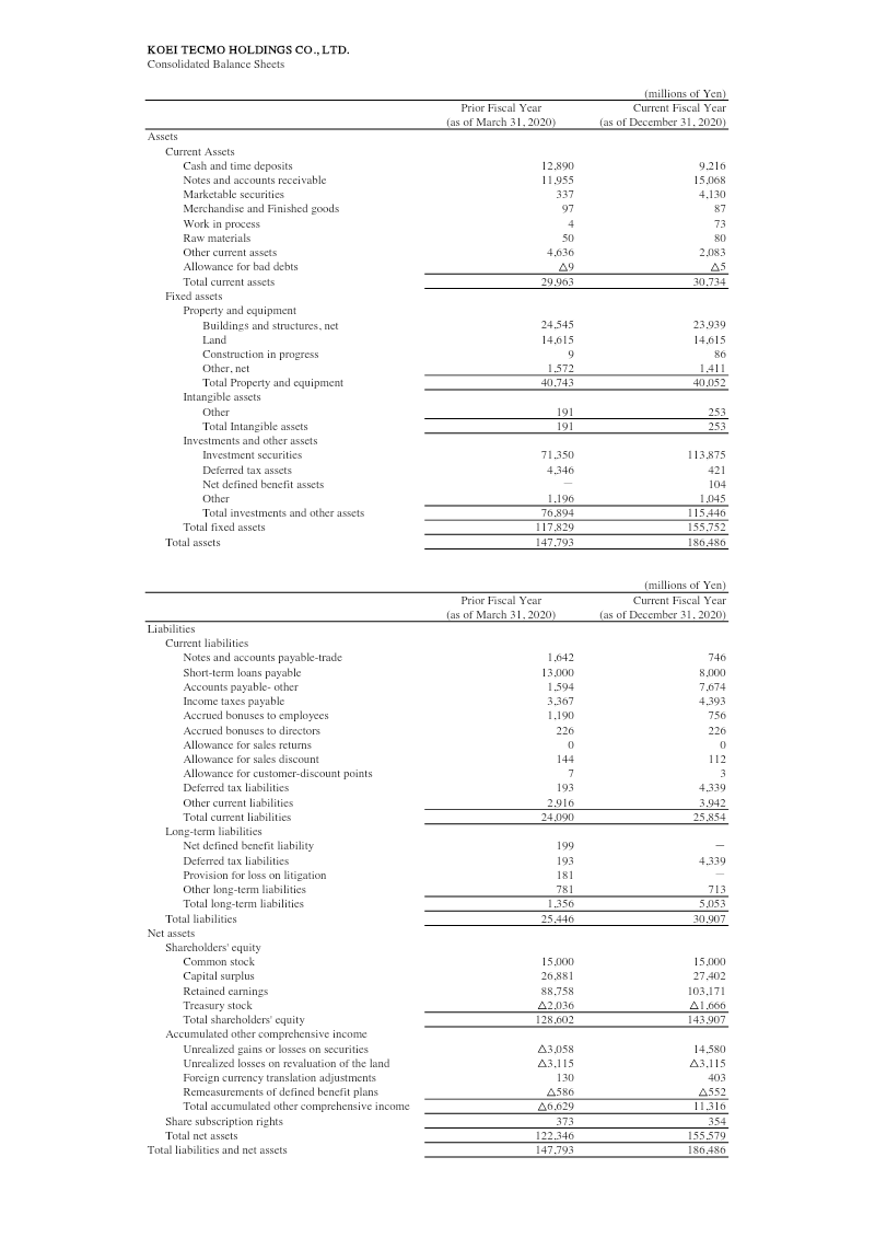 Financial highlights for the fiscal year ending March 2021 show a robust expansion of KOEI TECMO HOLDINGS’ revenue and profitability. Net sales rose 41.6 % from ¥42,645 million in FY2019 to ¥60,370 million in FY2020, driven mainly by the entertainment segment which grew 45.3 % to ¥56,808 million. Gross profit increased 73.2 %, operating income surged 73.0 % to ¥24,397 million, and net income nearly doubled, rising 93.1 % to ¥29,550 million. Forecasts for FY2021 anticipate a modest 7.7 % sales increase to ¥65,000 million and a slight operating income rise of 0.4 % to ¥24,500 million. The balance sheet reflects significant asset growth: total assets expanded from ¥147,793 million to ¥190,671 million, largely due to a jump in investment securities from ¥71,350 million to ¥113,176 million and an increase in net defined benefit assets. Current assets grew 12.5 % to ¥33,739 million, while current liabilities fell 12.8 % to ¥21,022 million, improving liquidity. Shareholders’ equity rose 18.8 % to ¥151,999 million, supported by retained earnings growth and a reduction in treasury stock. Geographically the company operates primarily within Japan, with revenue streams concentrated in entertainment and amusement. The period covered is FY2019 through FY2020, with forward guidance for FY2021. Data derive from consolidated financial statements prepared under Japanese GAAP, reflecting a comprehensive view of operating performance and balance sheet strength.