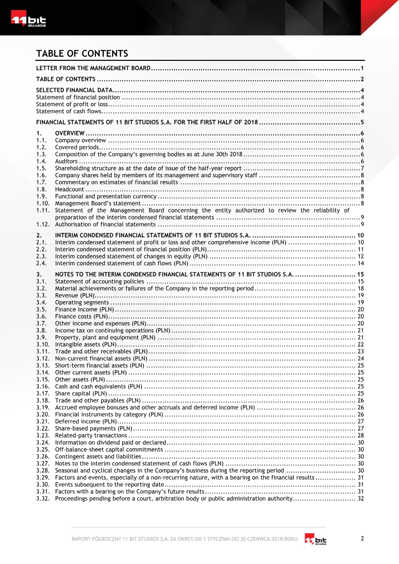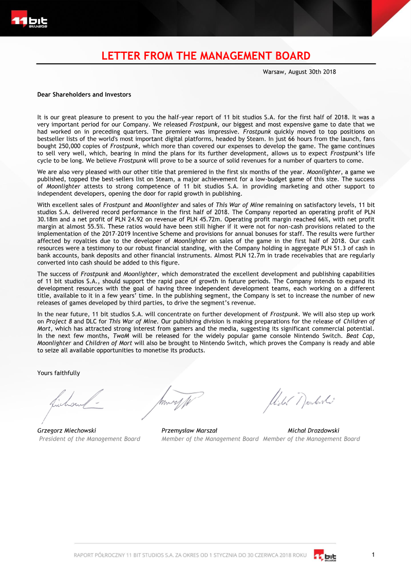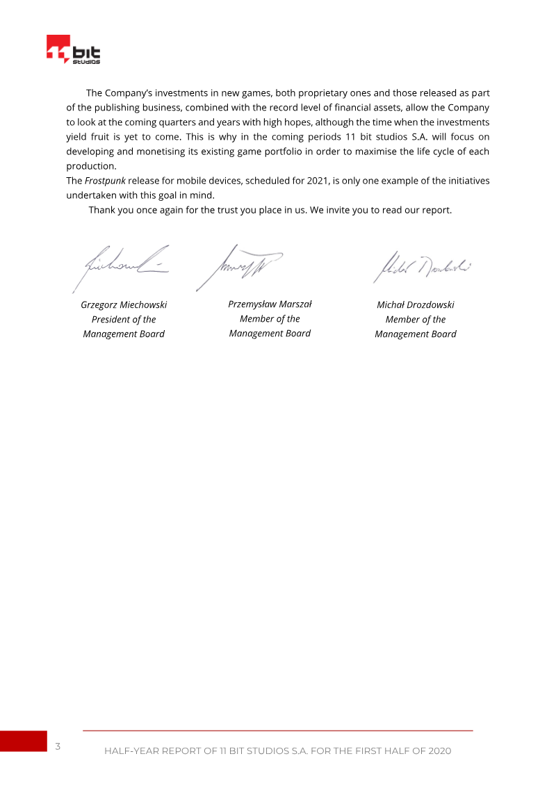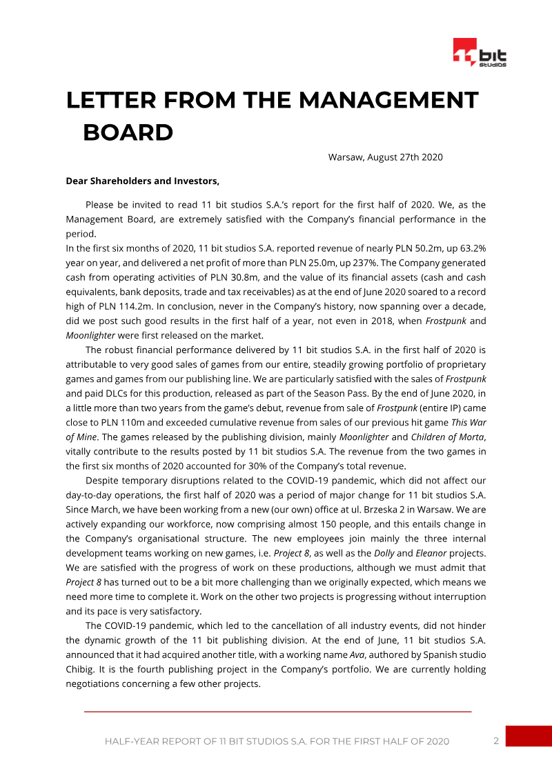 HALF-YEAR REPORT OF 11 BIT STUDIOS S.A. FOR THE FIRST HALF OF 2020 Dear Shareholders and Investors, Please be invited to read 11 bit studios S.A.’s report for the first half of 2020. We, as the Management Board, are extremely satisfied with the Company’s financial performance in the In the first six months of 2020, 11 bit studios S.A. reported revenue of nearly PLN 50.2m, up 63.2% year on year, and delivered a net profit of more than PLN 25.0m, up 237%.