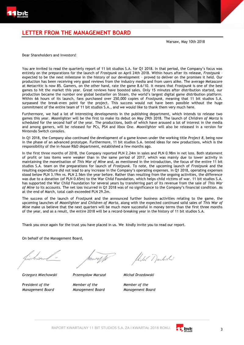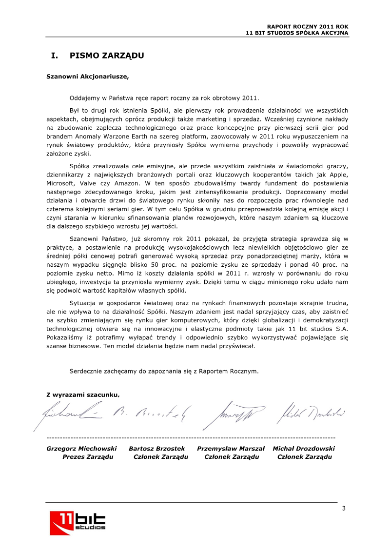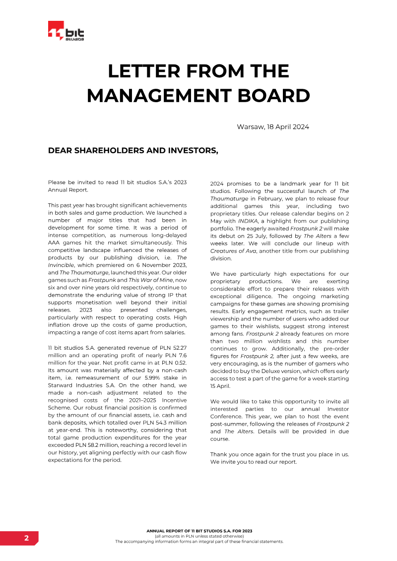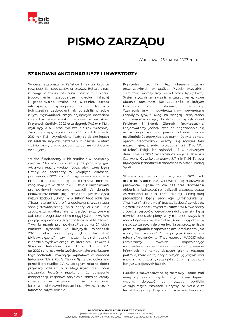 RAPORT ROCZNY 11 BIT STUDIOS ZA 2022 ROK (wszystkie kwoty podane są w złotych o ile nie podano inaczej) SZANOWNI AKCJONARIUSZE I INWESTORZY Serdecznie zapraszamy Państwa do lektury Raportu rocznego 11 bit studios S.A. za rok 2022. Był to dla nas, z uwagi na trudne otoczenie makroekonomiczne (spowolnienie gospodarcze, wysoka inflacja) i geopolityczne (wojna na Ukrainie), bardzo intensywny, wymagający rok.