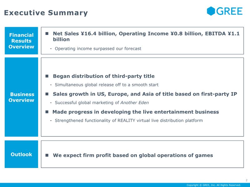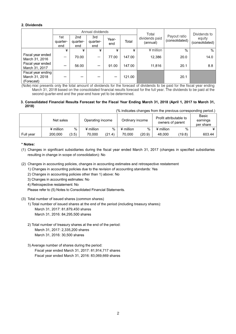 The quarterly consolidated financial results for mixi, Inc. cover the three‑month period ending June 30 2022 under Japanese GAAP. Net sales rose to ¥31,022 million from ¥28,529 million in the same period a year earlier, reflecting an 8.7 % increase driven primarily by the Digital Entertainment segment, notably Monster Strike. Operating income fell to ¥5,557 million from ¥6,015 million, a 7.6 % decline, largely due to higher operating expenses and a shift in revenue recognition for investment activities. Ordinary income attributable to owners of the parent decreased by 12 % to ¥5,326 million, while comprehensive income contracted to ¥3,548 million (10.5 % of sales). Earnings per share declined from ¥54.04 to ¥48.57 (basic) and from ¥53.32 to ¥47.82 (diluted). Total assets were ¥215,217 million with net assets of ¥185,626 million, maintaining an equity ratio near 85 %. Cash and cash equivalents fell to ¥116,117 million, largely due to significant treasury share repurchases of ¥2.3 billion and dividend payments totaling ¥3.7 billion.