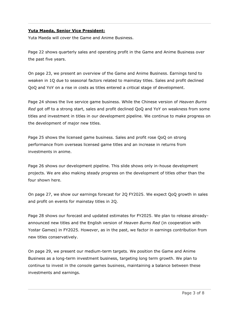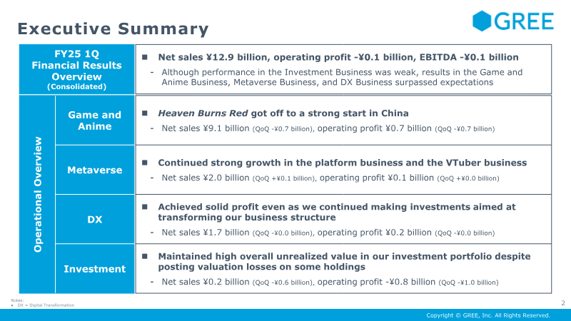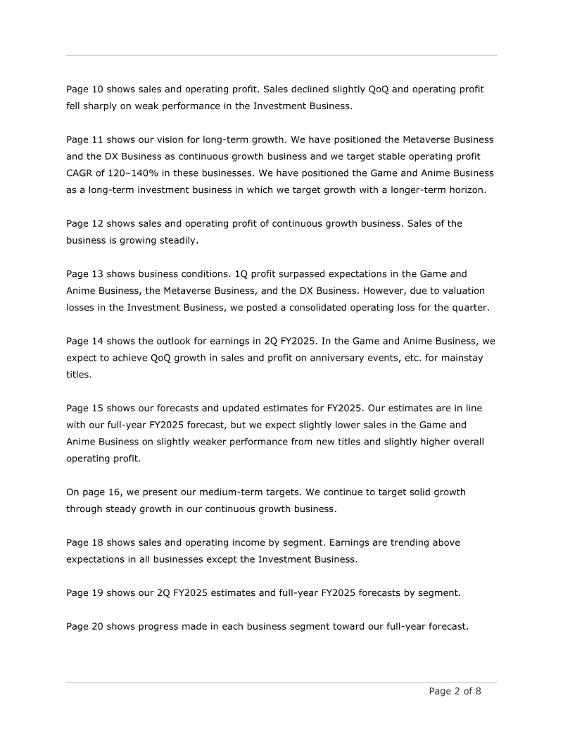 The briefing presents FY2025 first‑quarter results for GREE, Inc., highlighting a net sales figure of ¥12.9 billion and an operating loss of ¥0.1 billion, largely driven by valuation losses in the Investment Business and foreign‑exchange impacts from yen appreciation. While Game and Anime, Metaverse, and DX segments exceeded forecasts—thanks to strong performance of the Chinese version of *Heaven Burns Red*, continued growth in platform and VTuber services, and solid DX profitability—the Investment Business posted a ¥0.8 billion operating loss due to crypto‑asset valuation declines and write‑downs on maturing funds. Variable costs rose from advertising spend and investment losses, whereas fixed costs remained relatively stable. Geographically, the company operates globally with significant overseas assets; the report notes a ¥1.4 billion FX loss affecting ordinary and net profit. The management plan positions Metaverse and DX as continuous‑growth businesses targeting a 120–140 % CAGR in operating profit, while Game and Anime are treated as long‑term investment assets. Medium‑term targets emphasize aggressive investment in VTuber talent and DX product development, with expectations of profitability from the VTuber segment by FY2026 and accelerated growth in DX by FY2027. Methodologically, the briefing relies on quarterly financial statements, segment‑level performance data, and investment portfolio valuations. The Investment Business’s dual GP/LP structure is explained to contextualize volatility, with an emphasis on long‑term stability despite short‑term losses. Overall, the company projects FY2025 results in line with prior forecasts but anticipates slightly lower Game and Anime sales, offset by higher operating profit from continuous‑growth segments.