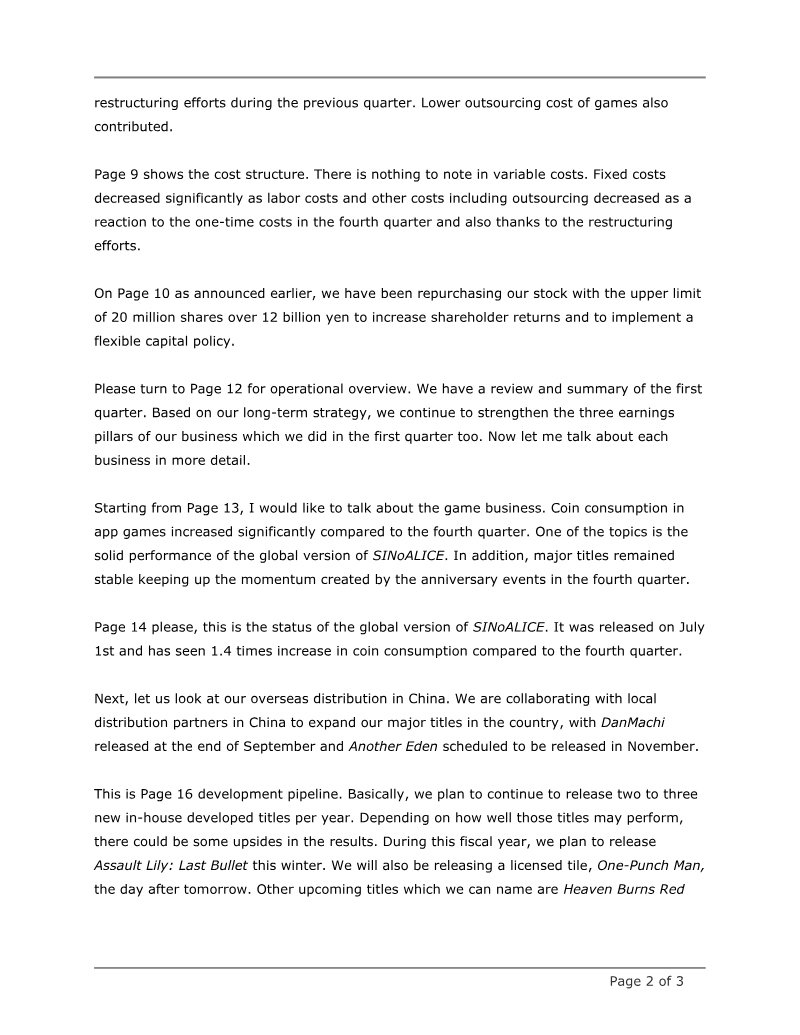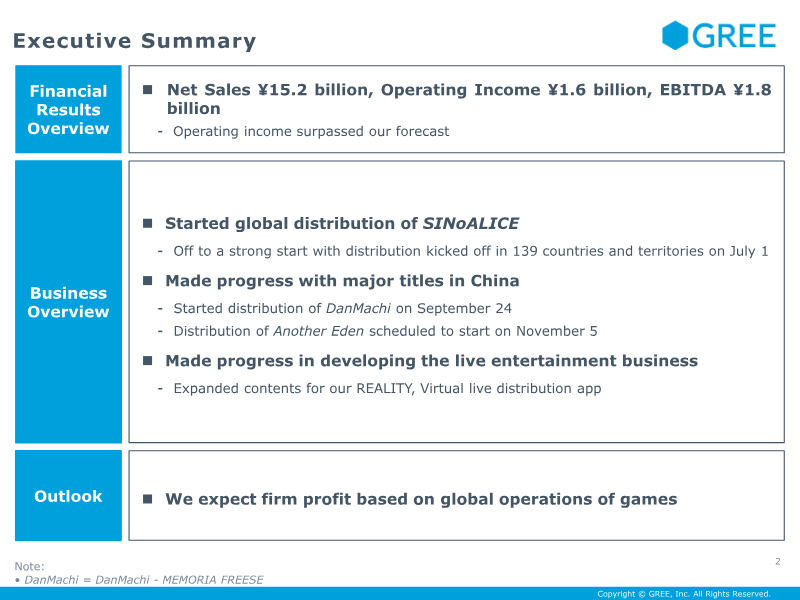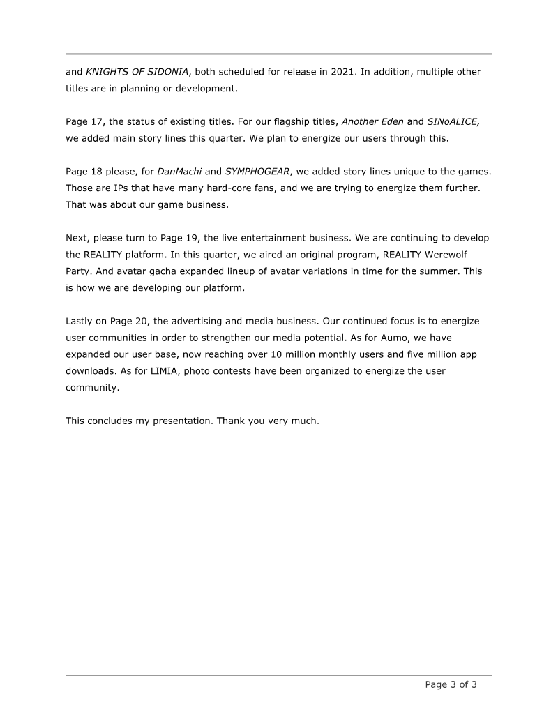 The briefing outlines GREE’s performance and strategic outlook for the second quarter of FY2023, focusing on its Internet and Entertainment Business. Sales in the Game and Anime segment remained steady for “Heaven Burns Red,” though revenue tapered after the half‑year anniversary promotion; growth continued in Metaverse and Commerce & DX divisions. The company anticipates a one‑year anniversary event for the Japanese version of Heaven Burns Red and imminent releases in Korean and traditional Chinese, with pre‑registrations already generating significant buzz at local game shows. The Anime Business is positioned to secure and diversify intellectual property, enabling in‑house development of game‑to‑anime adaptations that can enhance user engagement and revenue. Metaverse operations, branded as REALITY, have surpassed the break‑even point and achieved profitability. Over the past six months, overseas sales grew markedly, with North America leading after Japan, followed by Indonesia and Thailand. User demographics skew female and Generation Z, with a strong preference for private communication features. Monetization streams—live‑stream gifting, avatar sales, and in‑game purchases—are expanding consistently across regions. Advertising spend is expected to rise in the third quarter, driven by anniversary events and new language releases for Heaven Burns Red, as well as intensified promotion of REALITY. Operating income projections for the Internet and Entertainment Business in Q3 FY2023 range from ¥1.0 billion to ¥1.5 billion, contingent on the performance of the Korean and Chinese versions. The Investment and Incubation Business remains cautious, with potential short‑term losses anticipated due to market conditions. However, diversified investment timing and targets are projected to stabilize contributions over the medium‑to‑long term.