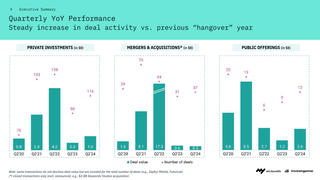 The Q2 '24 Gaming Deals Report presents a comprehensive snapshot of transaction activity across the global gaming industry for the second quarter of 2024. It documents a steady rebound in deal volume following the pandemic‑induced “hangover,” with private investments totaling $133 billion, mergers and acquisitions at $138 billion, and public offerings reaching $44 billion. The report highlights key transactions such as animeca’s $140 million investment, Lightspeed’s $964 million stake in a studio, and KRAFTON’s $15 million acquisition of ARISTRAT. Corporate, VC, and PE rounds collectively surpassed a new quarterly benchmark of $1 billion across 116 deals.