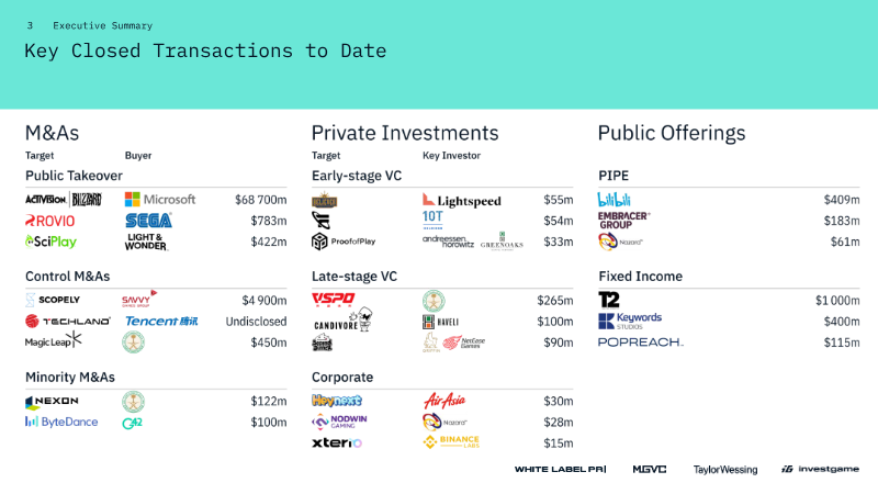 The report examines gaming‑industry deal activity through Q3 2023, highlighting a pronounced contraction in private investment and M&A relative to the pandemic‑era peak. Private equity raised only $2.3 billion in 2023 YTD, a four‑fold decline from the $9.1 billion average of 2021–22, with deal counts falling by roughly 23 %. Early‑stage rounds remain comparatively resilient, yet large Series A and later funding have shrunk to one‑third of 2021–22 levels, reflecting tighter capital and longer fundraising cycles. M&A volume also contracted sharply; total exit value dropped to $8.5 billion, 3.8‑times below the previous two years’ average, though a few high‑profile transactions—such as Microsoft’s $68.7 billion acquisition of Activision Blizzard and Tencent’s purchase of Techland—continue to shape the landscape. Public offerings stayed muted, with IPO activity limited to a handful of small‑cap listings and refinancing deals; higher interest rates have dampened investor appetite. Geographic analysis shows the United States, Asia, and Western Europe remain dominant, but early‑stage activity in Eastern Europe and Latin America is modest. Methodologically, the study aggregates closed transactions from public filings, media reports, and proprietary databases, focusing on companies whose core operations lie within the video‑game sector. The findings suggest a market in transition, with corporate and venture capital increasingly favoring co‑investment structures to mitigate risk amid ongoing macroeconomic uncertainty.