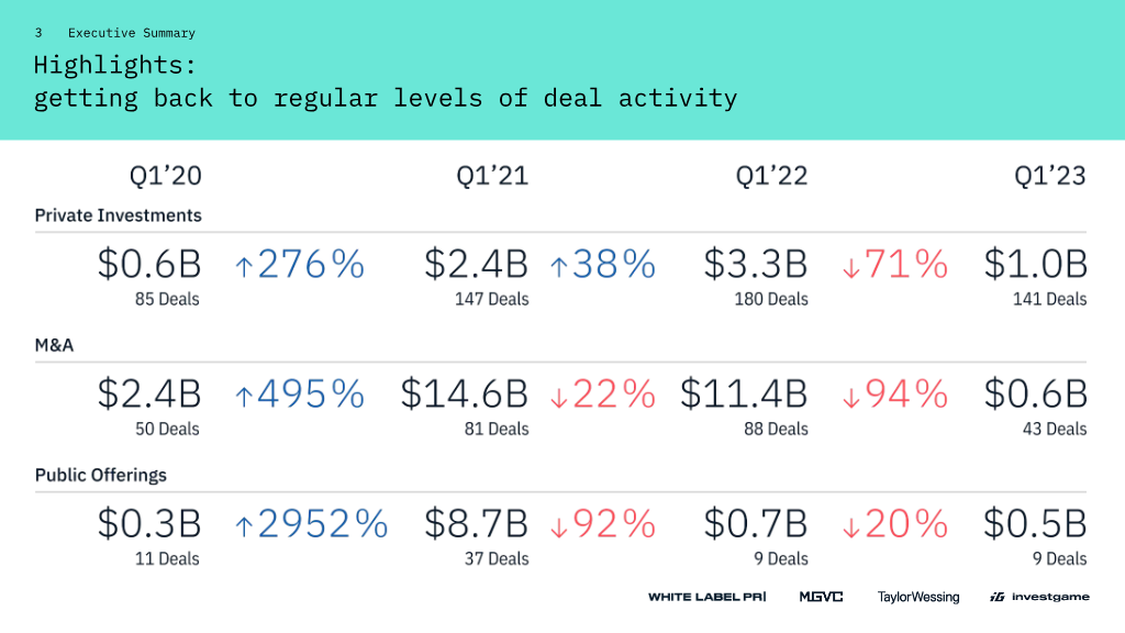 The Q1 '23 Gaming Deals Report documents a pronounced contraction in overall deal activity across the video‑games sector, with private investments falling to $1.0 billion from a record $3.3 billion in Q1 '22, while M&A volume collapsed to $0.6 billion from $11.4 billion the previous year. Public offerings also slipped to $0.5 billion, down 20 % from the $0.7 billion seen in Q1 '22, reflecting continued market uncertainty and high interest rates. Early‑stage venture capital remains the most resilient segment; deal counts rose by 30 % in Q1 '23, driven largely by Series A and Seed rounds that are smaller on average but more frequent. Late‑stage activity, however, is markedly weak, with only two closed deals and a negative trend in deal size. Corporate investment activity stayed roughly flat relative to Q1 '22, with strategic players such as NetEase and BANDAI NAMCO maintaining a steady presence but without significant growth in deal volume. The report’s methodology relies on closed transaction data from public media, S&P Capital IQ and proprietary research, focusing on mobile, PC & console, VR/AR and multiplatform segments. The analysis highlights a shift toward early‑stage funding as the primary engine of growth in an environment where M&A and public market activity remain subdued.