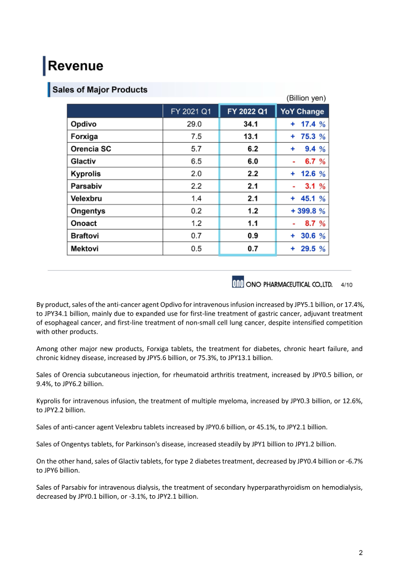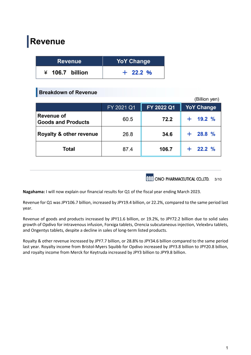Q1 Financial Results for the Fiscal Year Ending March 2023 Toshihiro Tsujinaka Senior Executive Officer, Executive Director, Kiyoaki Idemitsu Executive Officer, Executive Director, Satoshi Takahagi Corporate Officer, Executive Director, Sales and Marketing, Primary Care Business Kazuhiro Nagahama Director of Finance and Accounting Yukio Tani Corporate Executive Officer, Head of Corporate Communications FY 2021 Q1 FY 2022 Q1 YoY Change Revenue of ...