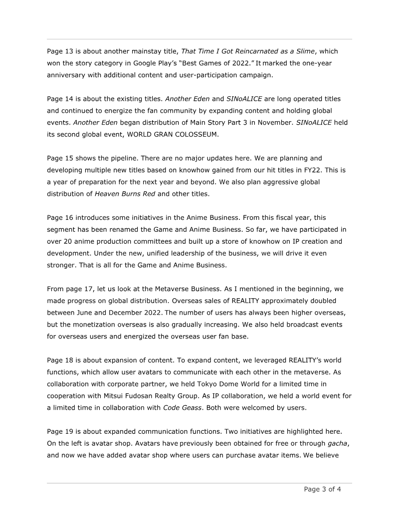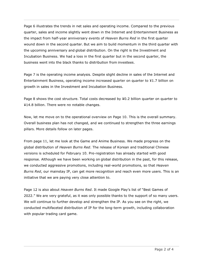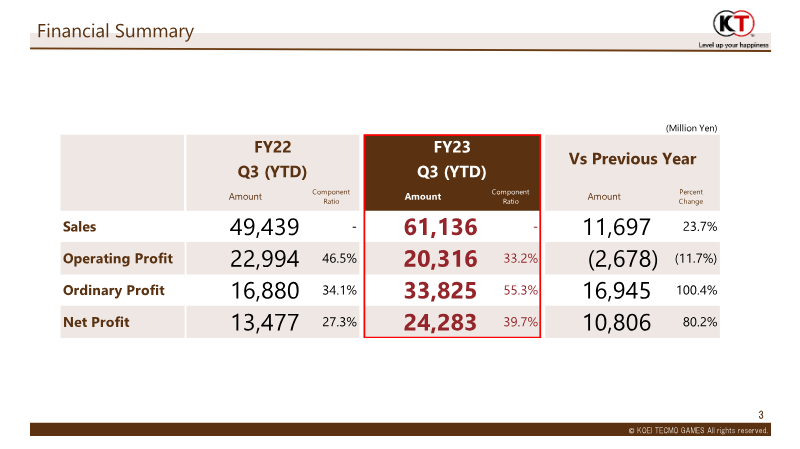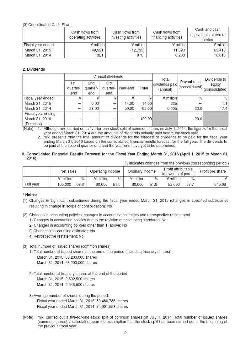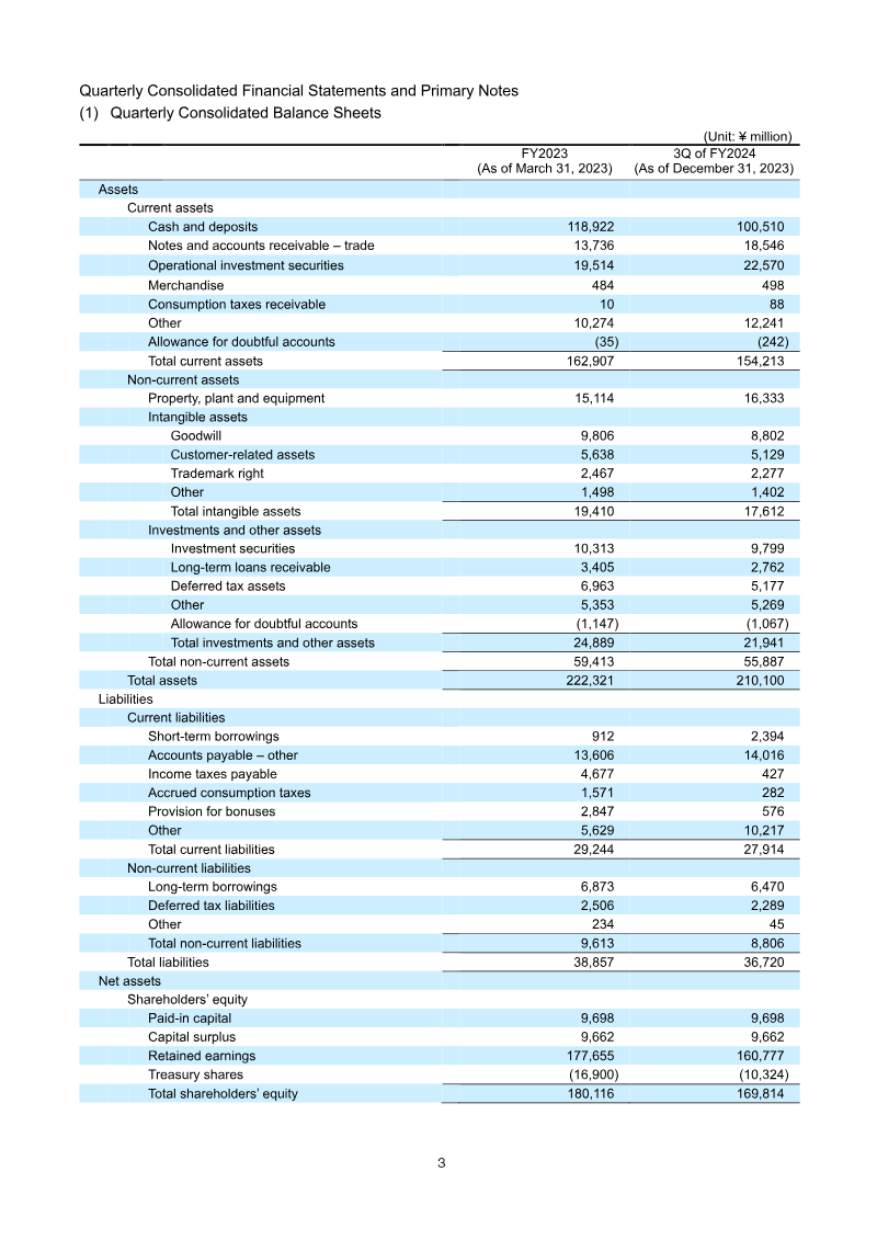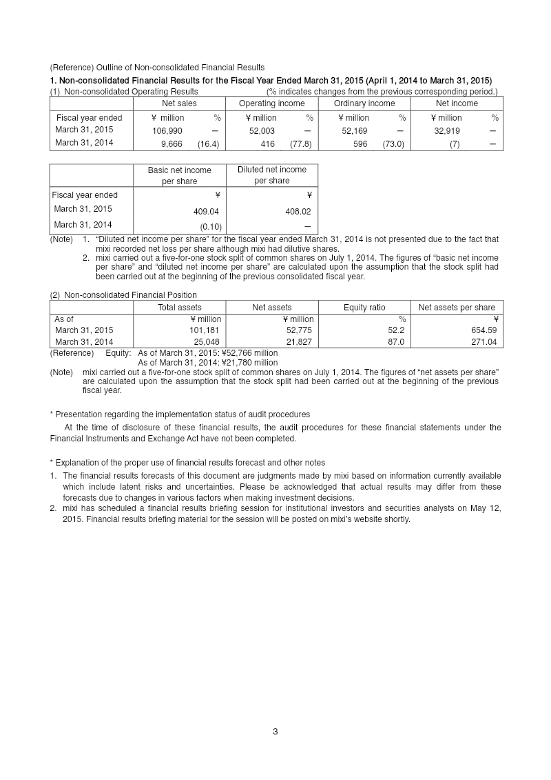 MIXI, Inc. reports consolidated financial results for the nine‑month period ending December 31 2023 under Japanese GAAP. Net sales rose modestly to ¥105,209 million, a 0.4 % increase from the prior year’s ¥104,802 million, while operating income fell sharply to ¥10,475 million from ¥19,073 million, reflecting a 45.1 % decline driven by higher operating expenses and reduced profitability in the Digital Entertainment segment, which remains the company’s primary revenue source. EBITDA decreased to ¥13,679 million from ¥22,476 million, a 39.1 % drop, and ordinary income to owners of the parent fell to ¥8,176 million versus ¥12,873 million previously. Comprehensive income for the period reached ¥4,879 million, up 65.1 % from ¥2,954 million in the same period a year earlier. Total assets contracted to ¥210,100 million from ¥222,321 million, while net assets declined to ¥173,379 million, maintaining an equity ratio of 81.3 %. Cash and cash equivalents fell to ¥100,290 million from ¥118,433 million, largely due to significant outflows for treasury share repurchases and dividend payments. The company announced no change in its dividend forecast, maintaining a quarterly payout of ¥55 million per share. The FY2024 full‑year forecast projects net sales of ¥146,000 million (down 0.6 %) and operating income of ¥18,000 million (down 27.5 %), indicating continued pressure on profitability. No material changes in accounting policies or significant subsidiaries were reported, and the company’s going‑concern status remains unchallenged.