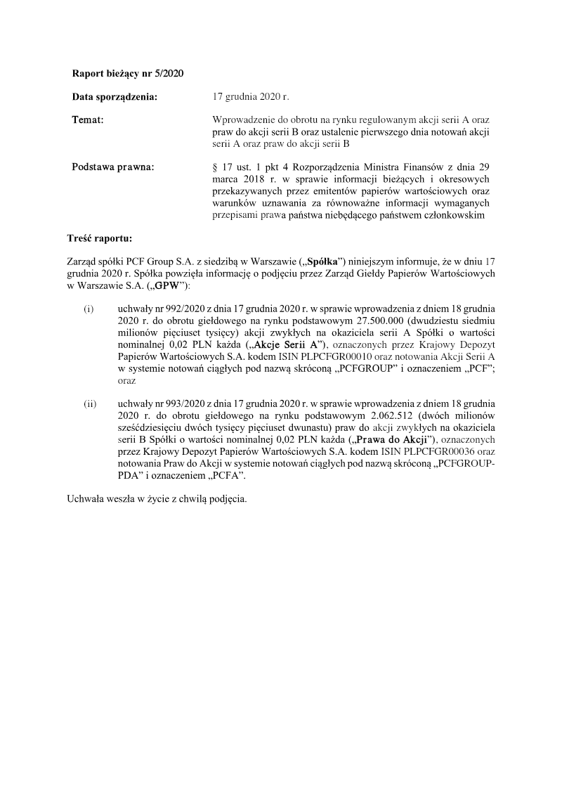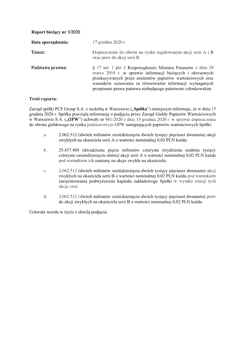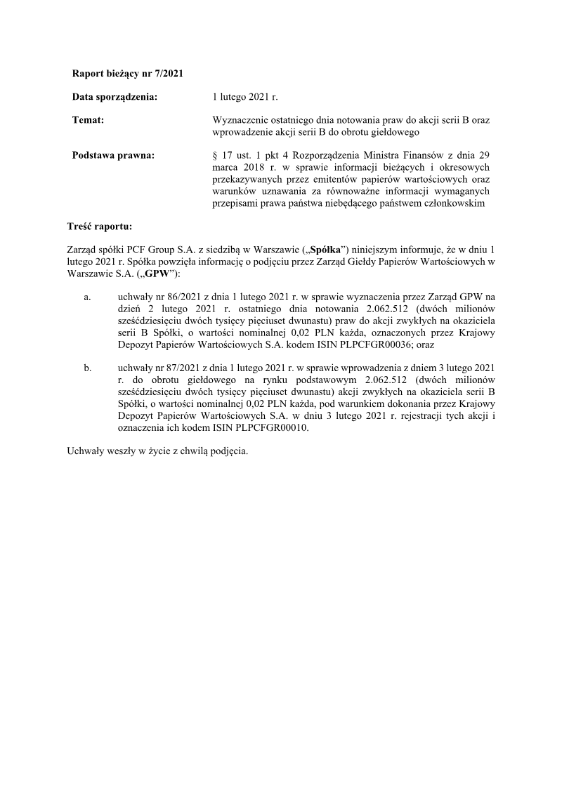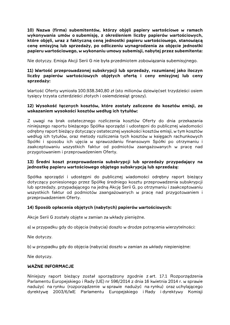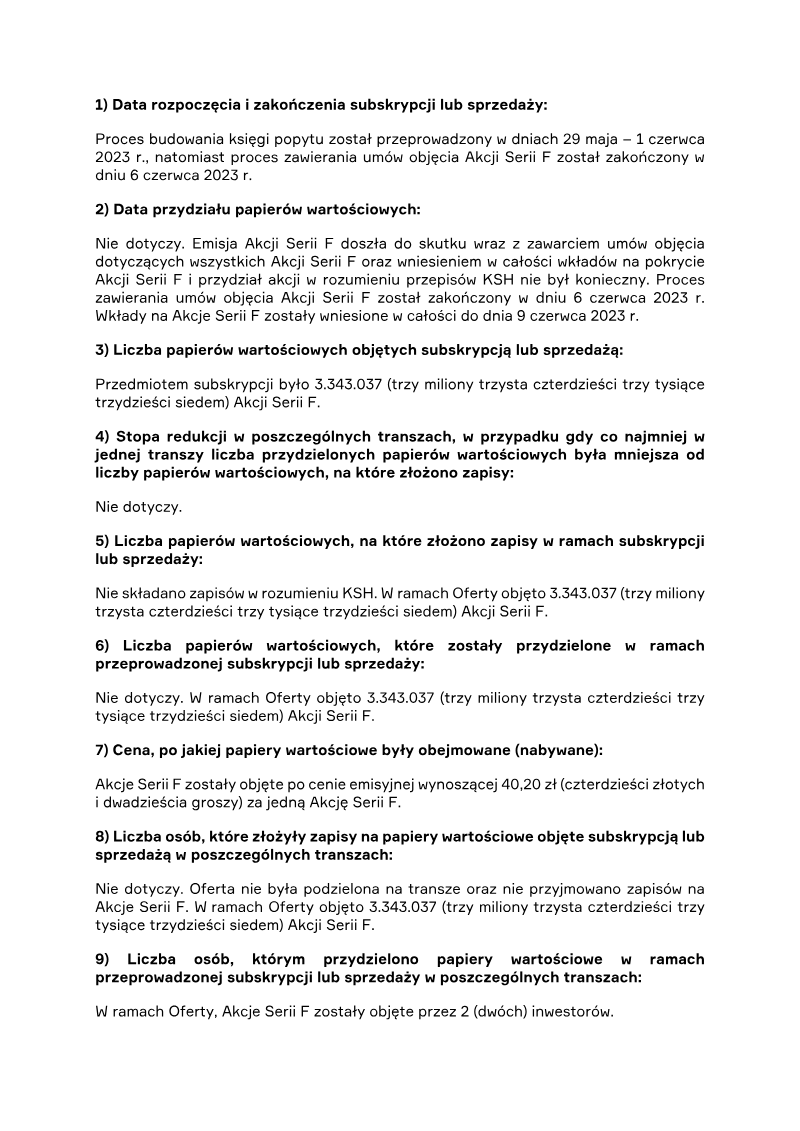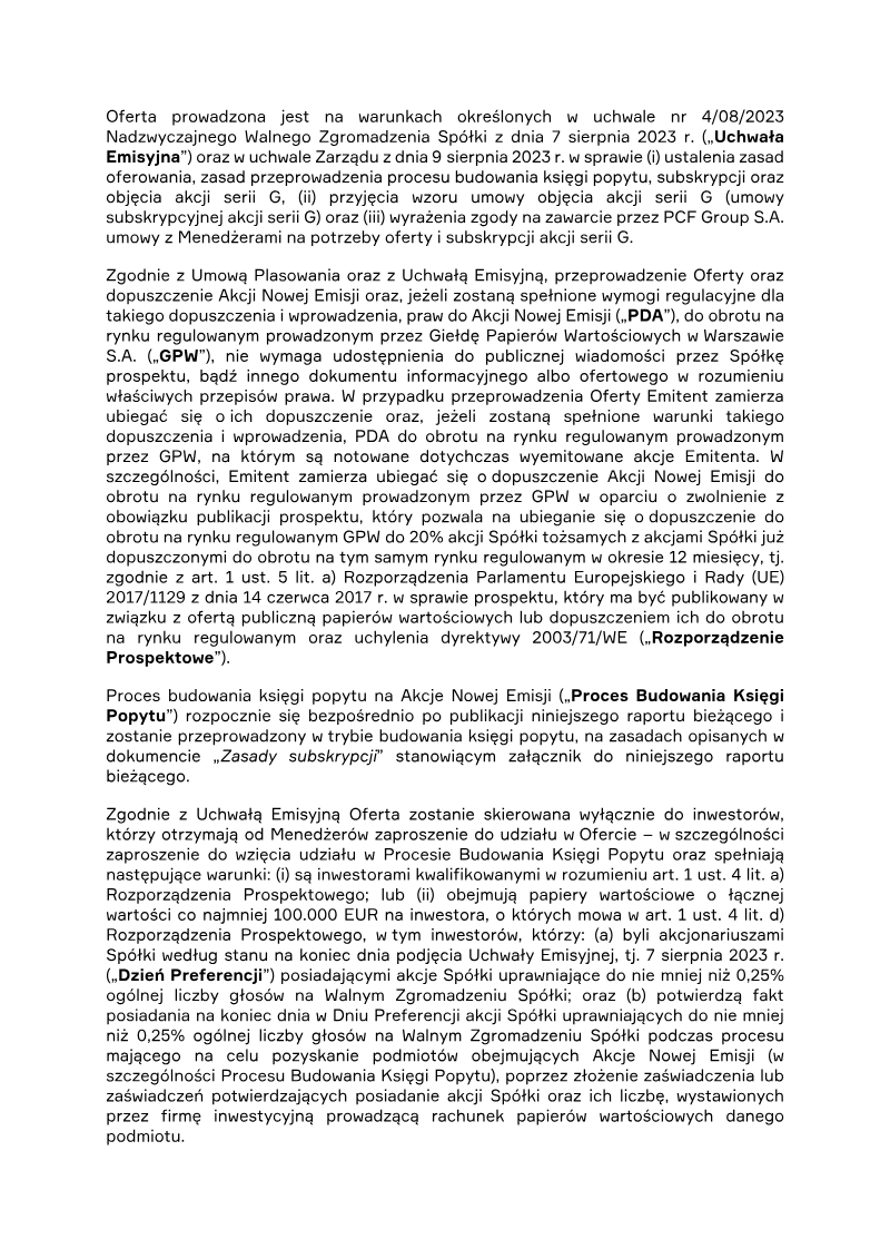 The report announces the completion of a private subscription offering 387,714 ordinary shares of Series D by PCF Group S.A., a Warsaw‑based company. The subscription was directed solely to Fiducie Familiale Samuel Girardin 2020, a trust established in Montreal for Samuel Girardin and related parties. The transaction was authorized by the company’s Extraordinary General Meeting on 24 May 2021 and finalized with a subscription agreement dated 31 May 2021. Each Series D share carried a nominal value of PLN 0.02 and was issued at an emission price of PLN 75.75, resulting in a total subscription value of PLN 29,369,335.50. The offering was conducted as a private placement under Polish company law (art. 431 §2(1) of the 2000 Companies Act), with no public solicitation or multiple tranches. Consequently, there were no subscription records, no allocation reductions, and the sole investor received all shares. The shares were paid for in cash; no sub‑emission arrangements or additional costs were disclosed at the time of reporting. Detailed cost breakdowns and average per‑share expenses are pending final invoicing and will be disclosed in a separate subsequent report. The transaction represents a capital increase for PCF Group, with the Series D shares intended to be listed on the Warsaw Stock Exchange and dematerialised in a securities depository, pending regulatory approval.