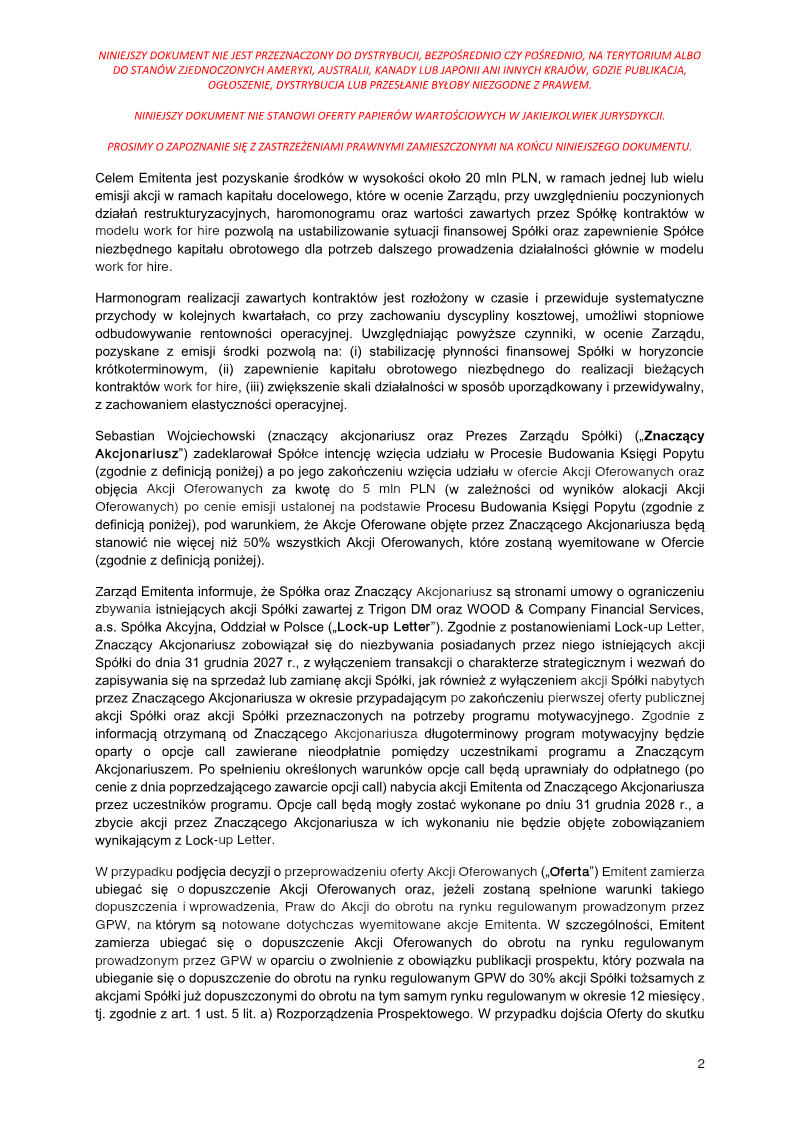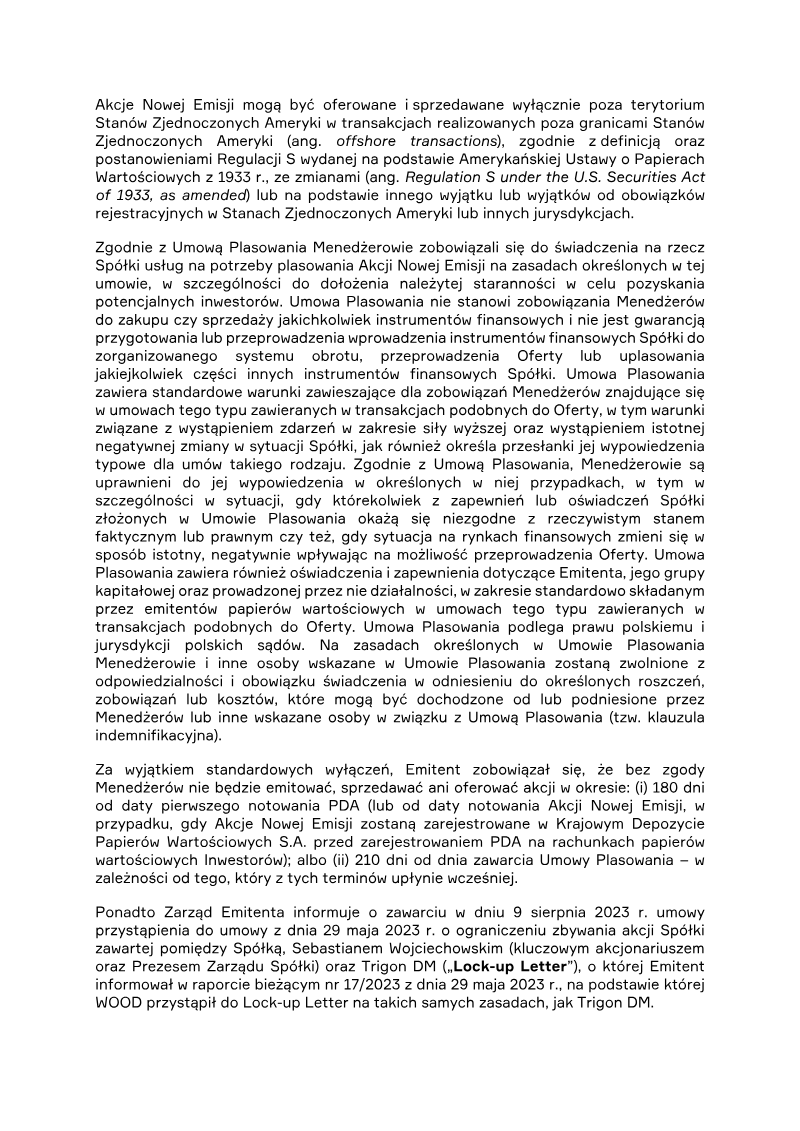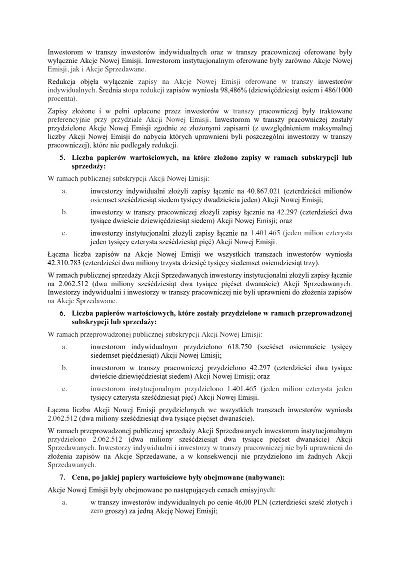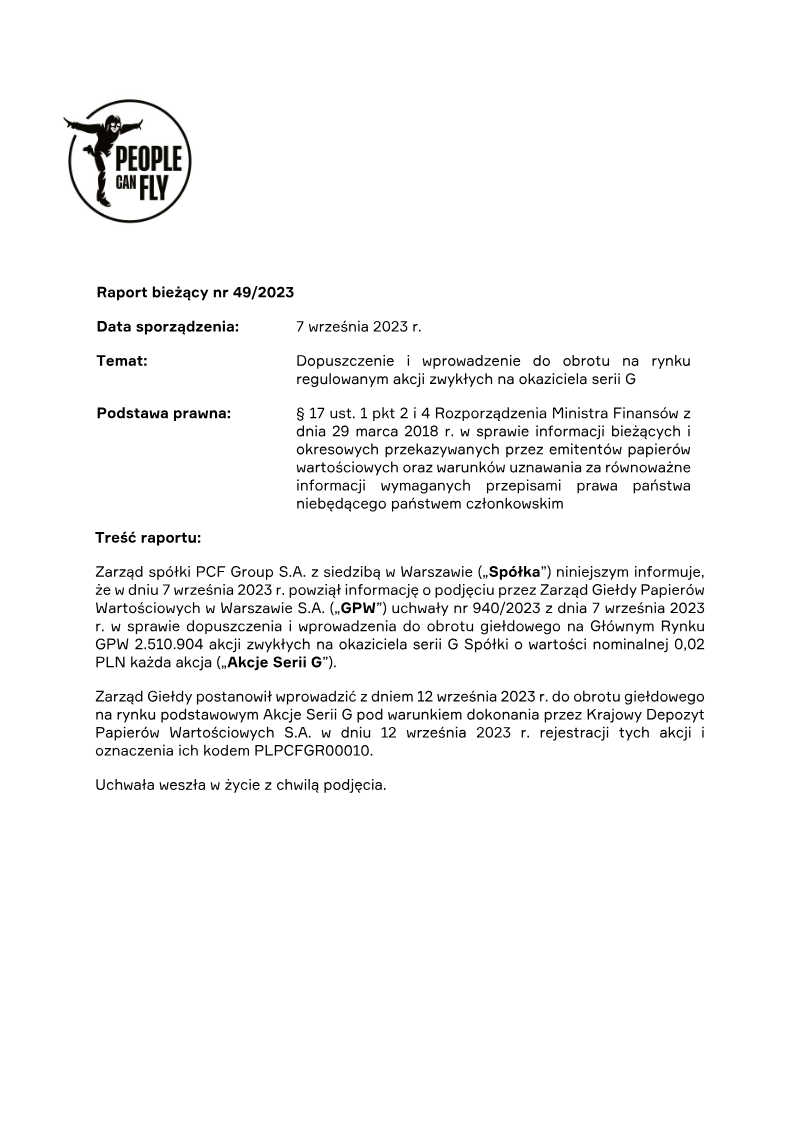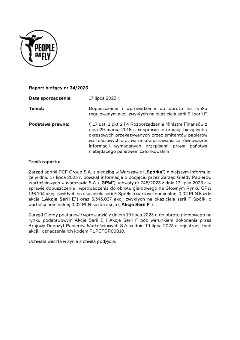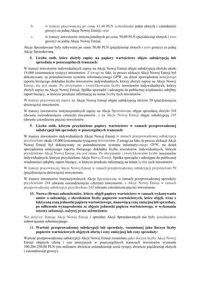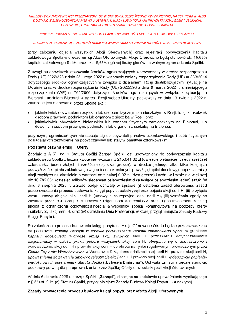 The report announces the completion of a private subscription offering 387,714 ordinary shares of Series D by PCF Group S.A., a Warsaw‑based company. The subscription was directed solely to Fiducie Familiale Samuel Girardin 2020, a trust established in Montreal for Samuel Girardin and related parties. The transaction was authorized by the company’s Extraordinary General Meeting on 24 May 2021 and finalized with a subscription agreement dated 31 May 2021. Each Series D share carried a nominal value of PLN 0.02 and was issued at an emission price of PLN 75.75, resulting in a total subscription value of PLN 29,369,335.50. The offering was conducted as a private placement under Polish company law (art. 431 §2(1) of the 2000 Companies Act), with no public solicitation or multiple tranches. Consequently, there were no subscription records, no allocation reductions, and the sole investor received all shares. The shares were paid for in cash; no sub‑emission arrangements or additional costs were disclosed at the time of reporting. Detailed cost breakdowns and average per‑share expenses are pending final invoicing and will be disclosed in a separate subsequent report. The transaction represents a capital increase for PCF Group, with the Series D shares intended to be listed on the Warsaw Stock Exchange and dematerialised in a securities depository, pending regulatory approval.