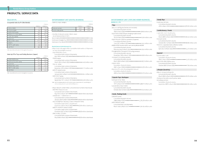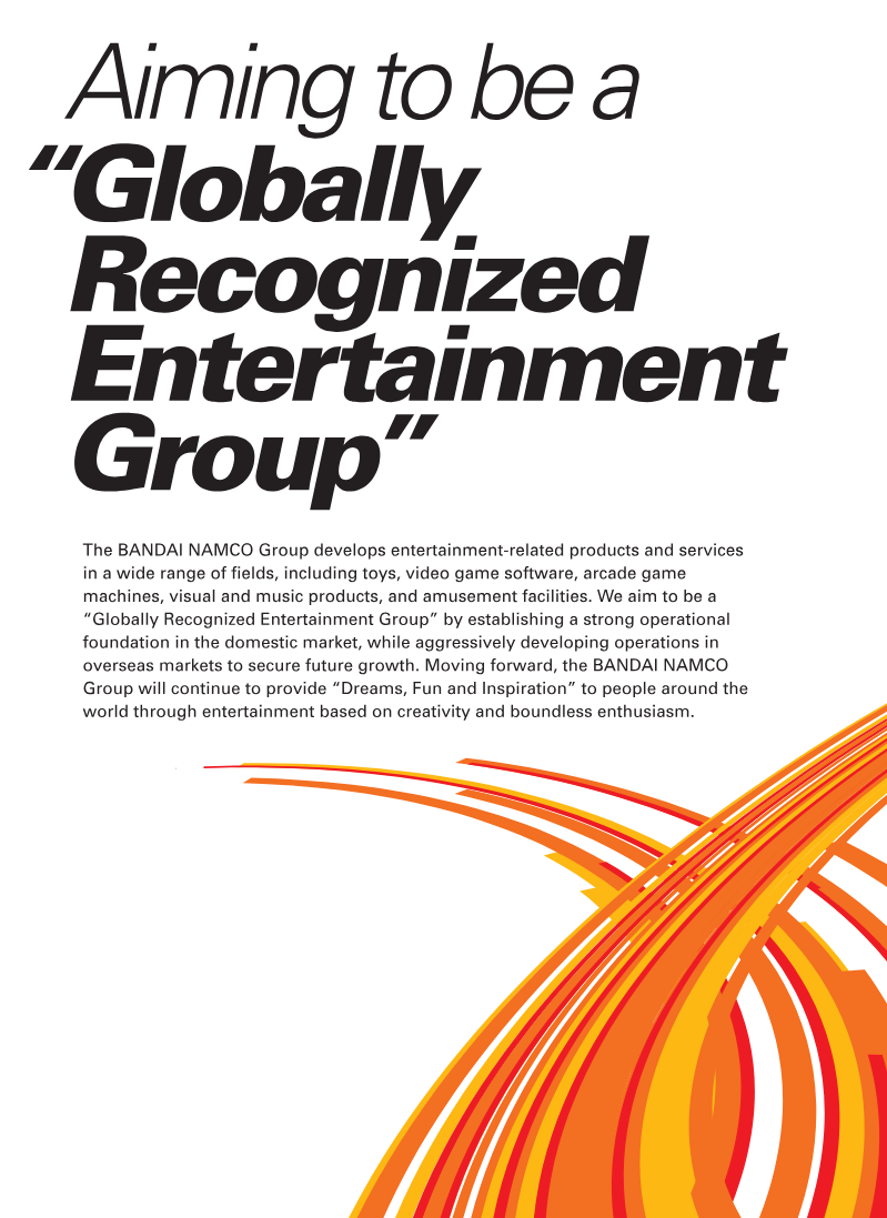 The BANDAI NAMCO Group develops entertainment-related products and services in a wide range of fields, including toys, video game software, arcade game machines, visual and music products, and amusement facilities. We aim to be a “Globally Recognized Entertainment Group” by establishing a strong operational foundation in the domestic market, while aggressively developing operations in overseas markets to secure future growth.