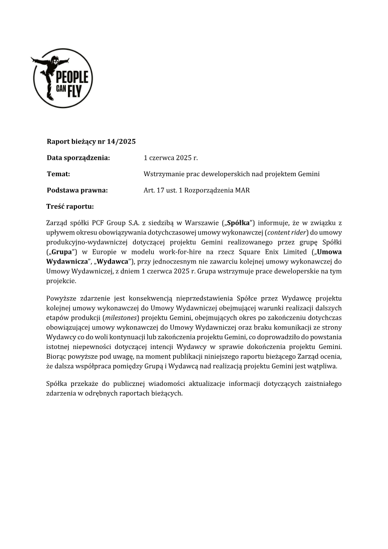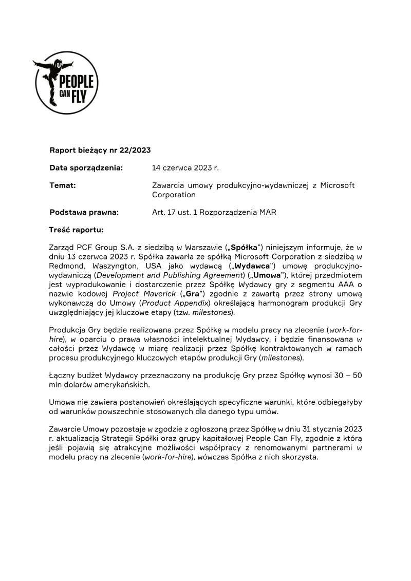 The report announces that on 13 June 2023 PCF Group S.A. entered into a Development and Publishing Agreement with Microsoft Corporation to produce and deliver an AAA‑grade title, code‑named Project Maveric k. The agreement designates Microsoft as the publisher and outlines a production schedule in a Product Appendix that details key milestones. PCF Group will develop the game under a work‑for‑hire model, with intellectual property rights retained by Microsoft. Funding is fully provided by the publisher and will be released as each milestone is achieved, with a total budget ranging from $30 million to $50 million. The contract follows standard industry terms for this type of partnership and does not contain any atypical provisions. The agreement aligns with PCF Group’s strategic update issued on 31 January 2023, which stated the company would pursue attractive work‑for‑hire collaborations with reputable partners. The project is geographically focused on the United States, given Microsoft’s headquarters in Redmond, Washington, and targets the global AAA gaming market. No survey or external data sources are cited; the report is a straightforward disclosure of contractual arrangements and financial commitments.