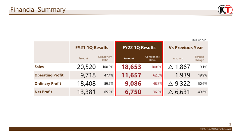 Financial highlights for the first quarter of fiscal year ending March 2013 reveal a mixed performance across Tecmo Koei Holdings’ operating segments. Net sales fell 12.7 % year‑over‑year to ¥35,525 million, driven primarily by declines in Game Software (−19.2 %) and Online & Mobile (−10.0 %). Media & Rights sales were essentially flat, while Pachislot & Pachinko and Other segments posted modest gains of 127.4 % and 59.1 %, respectively. The company’s operating income contracted sharply, dropping 92.8 % to ¥5,758 million; this was largely due to a steep decline in Game Software operating income (−84.5 %) and a 17.6 % drop in Online & Mobile operating income. Conversely, Pachislot & Pachinko operating income surged 1,400 % to ¥551 million, and Media & Rights turned a loss into a profit of ¥157 million. Net income decreased 48.8 % to ¥4,640 million, reflecting the overall revenue and operating income downturns. Forecasts for the full year project net sales of ¥39,000 million (up 9.8 %) and operating income of ¥7,000 million (up 21.6 %). The report covers Japan‑based operations for the first quarter of FY2012, with data presented in millions of yen. Methodological details are not disclosed beyond segment classification changes, notably the transfer of CWS Brains from Amusement Facilities to Online & Mobile.