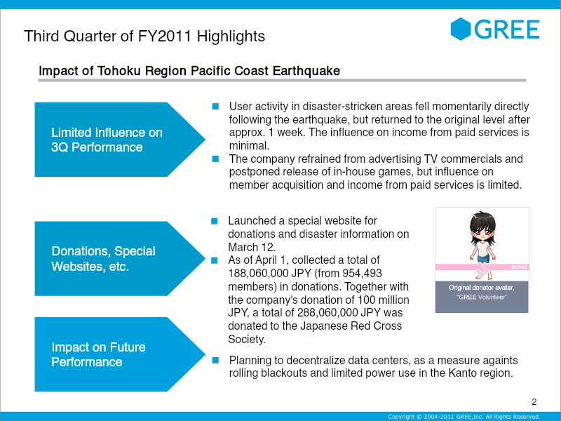 GREE, Inc. reported a robust fourth‑quarter performance for the fiscal year ending June 30 2011, driven by rapid user growth and expanding monetization across its global platform. Net sales rose 29 % to ¥21,093 million, while operating profit increased 19 % to ¥9,789 million; both figures represent the largest quarterly gains of FY2011. The company’s consolidated user base reached 123.6 million worldwide, with 26.4 million in Japan and a growing presence in the United States, Europe, China, and other Asian markets. The acquisition of OpenFeint added 50 million users and broadened GREE’s reach in emerging mobile markets. Revenue diversification is evident: paid‑service sales grew to ¥18,387 million, and advertising revenue climbed to ¥3,000 million. The company launched “GREE Market,” a pre‑installed app store on KDDI’s Android platform, and expanded its in‑app billing to web, Android, and iOS. Operating expenses rose 37 % YoY, largely due to increased advertising spend (27 %) and rental fees for data‑center decentralization. Strategic initiatives include standardizing smartphone platform specifications with mig33, partnering with Tencent and SK Telecom, and establishing a Beijing office to support development in China. Forecasts for FY2012 target net sales of ¥90–100 billion, operating profit of ¥40–50 billion, and net income of ¥22–28 billion, reflecting continued emphasis on user acquisition, platform expansion, and diversified revenue streams.