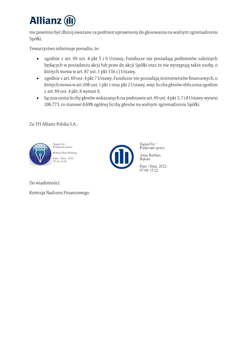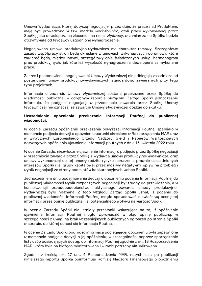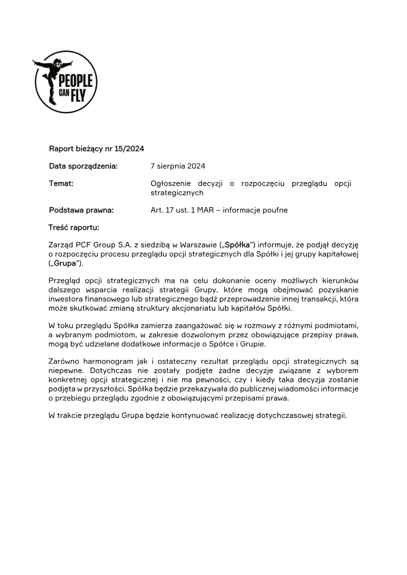 The document announces that Krafton, Inc. has entered into an investment agreement to acquire shares of PCF Group S.A. under a capital increase authorized by the extraordinary general meeting, allowing up to 5 853 941 new ordinary shares of series F at a nominal value of PLN 0.02 each. The agreement obligates Krafton to purchase shares representing 10 % of the company’s capital and voting rights at an issue price of PLN 40.20 per share, with the company guaranteeing allocation upon fulfillment of Krafton’s subscription commitment. The investment contract grants Krafton rights of first negotiation and first refusal on future projects such as Project Victoria or Project Bifrost if released outside a self‑publishing model, and includes anti‑dilution, tag‑along, and drag‑along provisions. Both parties have executed lock‑up agreements lasting until 28 March 2024 and standard representations, warranties, and indemnity clauses. The agreement is governed by Polish law, has a ten‑year term with automatic renewal provisions, and allows Krafton to terminate under specific circumstances such as cancellation of the offer or failure to meet subscription deadlines; no penalties are stipulated. The report, prepared under EU Regulation MAR, is strictly informational and restricted to qualified investors within the European Economic Area, excluding public distribution in jurisdictions such as the United States, Canada, Australia, Japan, and South Africa. It contains forward‑looking statements subject to risks and uncertainties, and disclaims any investment recommendation or guarantee.