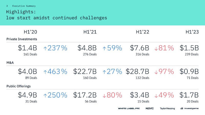 The first half of 2023 marked a significant downturn in gaming industry deal activity, characterized by a sharp contraction in total deal value across private investments, mergers and acquisitions (M&A), and public offerings. Total private investment fell to $1.5 billion across 239 deals, representing a fivefold decline in value compared to the same period in 2022. M&A activity saw an even more dramatic 31x drop in value, falling to $0.9 billion as strategic investors shifted focus toward internal restructuring, layoffs, and cost optimization rather than aggressive expansion. The venture capital landscape remains dominated by early-stage activity, as pre-seed and seed rounds are less susceptible to macroeconomic volatility. While the number of early-stage deals remained relatively stable, the total capital raised shrank by more than half to $269 million. Late-stage investments have largely paused due to a closed IPO window and a lack of viable exit opportunities, leading to a disconnect between investor expectations and startup valuations. Geographically, North America led early-stage VC activity with 24 deals, followed by Western Europe and the MENA region. Public markets remained muted, with companies increasingly choosing to postpone listings or engage in share buybacks. Despite the general market cooling, artificial intelligence has emerged as a resilient niche; investments in AI-related gaming companies rose to $214.1 million across 19 deals in the first half of 2023. Analysts anticipate a potential recovery in the latter half of the year, driven by the closing of major pending deals, such as the Savvy Games Group acquisition of Scopely and Microsoft’s pursuit of Activision Blizzard, alongside a significant amount of unallocated venture capital waiting to be deployed.