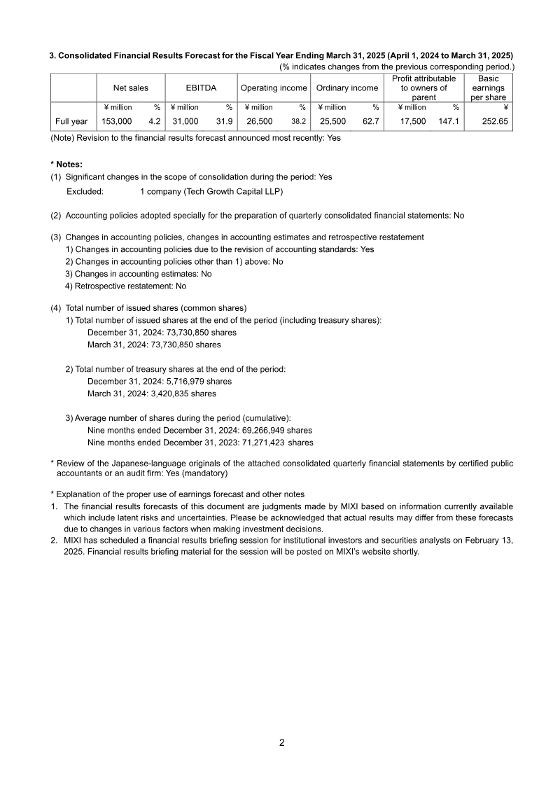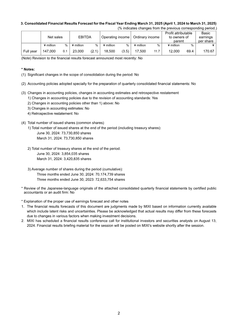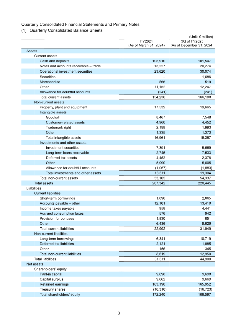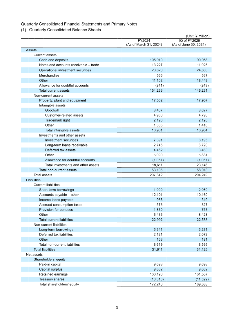 The quarterly consolidated financial results for the three months ended June 30, 2023 show a modest decline in net sales to ¥18.30 billion from ¥18.65 billion a year earlier, representing a 1.9 % drop. Operating profit fell sharply to ¥7.51 billion, a 35.6 % decrease from the prior year’s ¥11.66 billion, while ordinary profit contracted to ¥10.55 billion from ¥14.69 billion, a 28.5 % decline. Profit attributable to owners of the parent company decreased to ¥6.75 billion versus ¥10.55 billion, a 36.3 % reduction. Basic earnings per share fell to ¥33.46 from ¥21.43, and diluted earnings per share dropped to ¥31.24 from ¥19.86. Total assets increased to ¥232.80 billion, driven largely by higher investment securities and cash balances, while net assets rose to ¥144.25 billion, improving the capital adequacy ratio from 67.4 % to 61.7 %. Shareholders’ equity remained stable at ¥144.13 billion, with retained earnings slightly lower due to the operating loss. The company forecasts full‑year 2024 net sales at ¥95.00 billion, a 21.1 % increase over the previous year, and operating profit at ¥37.50 billion, a 4.2 % decline from the prior year’s ¥40.50 billion. Ordinary profit is projected at ¥31.00 billion, a 0.2 % rise, and earnings per share at ¥98.40. The report covers Japan‑based operations under Japanese GAAP for the fiscal year ending March 31, 2024. Methodology follows standard quarterly consolidation procedures with no changes in accounting policies or significant subsidiary adjustments during the period. The company issued 336 million shares, with an average of 315 million shares outstanding during the quarter.