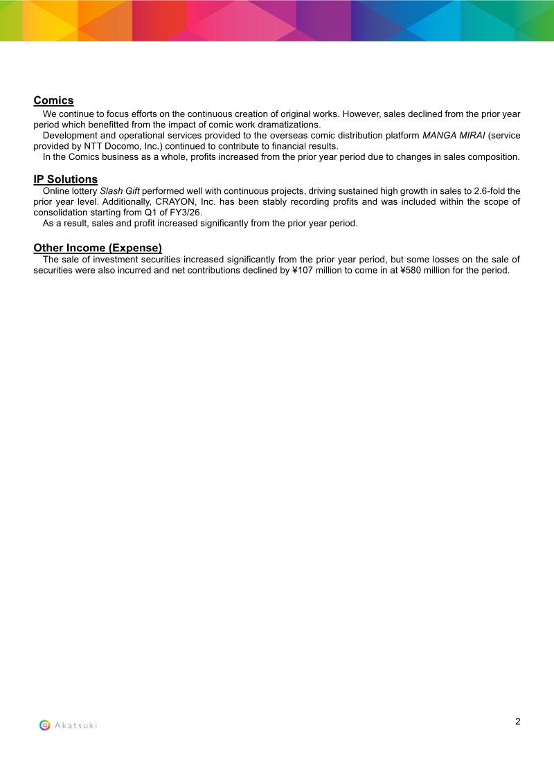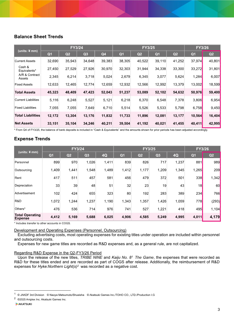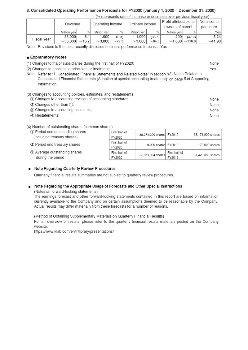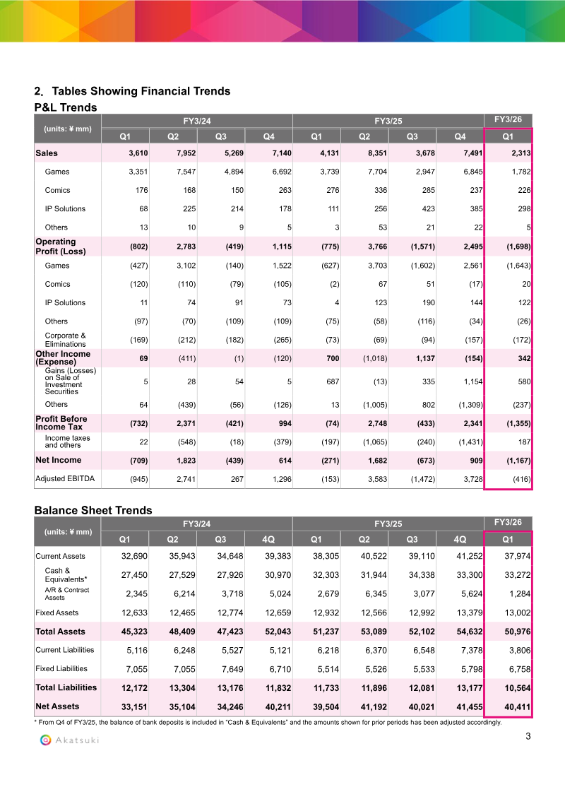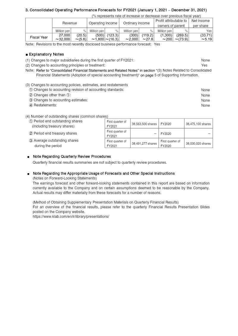 KLab Inc. reported a sharp decline in third‑quarter operating performance for fiscal year 2021, with revenue falling 29.0 % to ¥18.7 billion from ¥26.4 billion in the same period of FY2020. Operating income turned negative, registering a loss of ¥729 million versus a profit of ¥2.25 billion the prior year, and ordinary income declined to a loss of ¥850 million. Comprehensive income mirrored this deterioration, slipping from a profit of ¥787 million to a loss of ¥1.68 billion, largely driven by a ¥1.54 billion impairment loss on investments and a significant foreign‑exchange loss of ¥167 million. Net assets decreased to ¥14.7 billion, with shareholders’ equity falling from ¥16.6 billion to ¥14.4 billion, while the equity ratio remained stable at approximately 70 %. The company’s forecast for FY2021 projects total revenue of ¥24.0 billion, a 29.3 % decline from FY2020, and an operating loss of ¥1.6 billion, confirming the downward trend. The financial statements cover Japan‑based operations for the first nine months of FY2021 (January 1–September 30, 2021) and are prepared under Japanese GAAP. The report includes consolidated balance sheets, income statements, comprehensive income statements, and detailed notes on equity changes, treasury stock transactions, and accounting policy adjustments. No significant changes to accounting principles were noted beyond the adoption of a special tax treatment for effective tax rate estimation. The company’s segment analysis confirms that the game business remains the primary revenue driver, while other businesses contribute modestly. Overall, KLab’s financial position weakened in the third quarter, with losses driven by investment impairments and foreign‑exchange effects, and the company anticipates continued revenue contraction for the remainder of FY2021.
