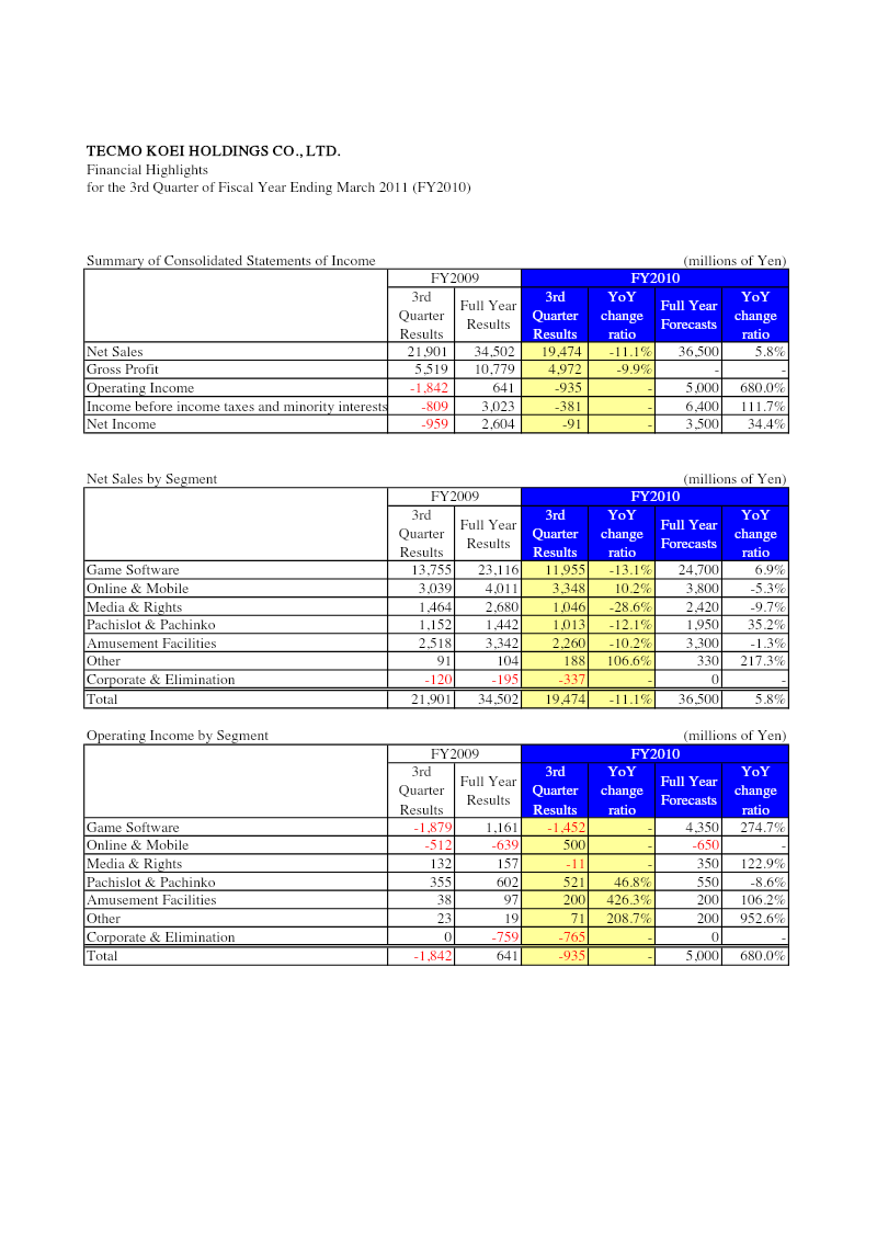 The financial highlights for the third quarter of fiscal year ending March 2011 show a marked turnaround from the prior year. Net sales rose to ¥34,502 million, up 11.1% from the same quarter in FY2009 and slightly below the ¥36,500 million forecast. Gross profit increased to ¥10,779 million, a 9.9% rise over the previous year’s quarter. Operating income swung from a loss of ¥1,842 million to a profit of ¥641 million, reflecting an 680% improvement. Income before taxes and minority interests climbed to ¥3,023 million, a 111.7% increase, while net income rebounded to ¥2,604 million, a 34.4% gain. Segment performance varied: Game software sales grew to ¥23,116 million (6.9% above forecast) but declined 13.1% from the prior year’s quarter; Online & Mobile sales increased by 10.2%; Media & Rights fell sharply by 28.6%; Pachislot & Pachinko sales rose 12.1%; Amusement Facilities grew 10.2%; and Other revenue surged 106.6%. Operating income by segment shifted from losses in Game software and Online & Mobile to profits across all segments, with Amusement Facilities and Other showing the largest percentage gains (426.3% and 208.7%, respectively). Geographically, the data encompass Japan’s domestic market across gaming software, online/mobile platforms, media rights, pachislot/pachinko machines, amusement facilities, and ancillary services. The period covers the third quarter of FY2010 (April–June 2010), with comparisons to the same quarter in FY2009 and full‑year figures. The analysis relies on consolidated financial statements, with no explicit survey methodology noted. Overall, the company achieved a significant recovery in profitability and revenue diversification during this quarter.