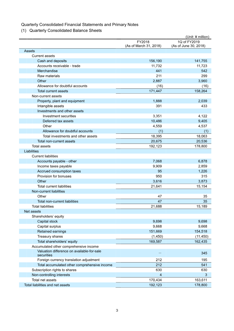 The nine‑month financial results for mixi, Inc., covering April 1 to December 31, 2018, show a sharp decline in performance compared with the same period in 2017. Net sales fell by 21.7 % to ¥105,983 million, while operating income dropped 43.8 % to ¥26,899 million and ordinary income fell 44.0 % to ¥26,985 million. Profit attributable to owners of the parent decreased 31.9 % to ¥17,101 million, and comprehensive income contracted 30.5 % to ¥17,462 million. Basic earnings per share fell from ¥320.33 in 2017 to ¥225.50 in 2018, reflecting the revenue shortfall and higher operating expenses. Total assets declined from ¥192,123 million at March 31, 2018 to ¥185,298 million at December 31, 2018, while net assets remained high at ¥169,226 million, giving an equity ratio of 91.0 %. The company’s liquidity position weakened slightly; cash and deposits fell from ¥156,190 million to ¥140,880 million. Treasury share holdings increased markedly, with 2,881,300 shares outstanding by year‑end. Segment analysis indicates that the Entertainment Business generated ¥101,590 million in sales and a profit of ¥34,297 million, whereas the Lifestyle Business contributed ¥4,393 million in sales but incurred a loss of ¥1,245 million. Impairment losses related to the Lifestyle segment’s Ticket Camp service amounted to ¥131 million, and goodwill was fully amortized at ¥7,597 million. For the fiscal year ending March 31, 2019, mixi forecasts net sales of ¥155,000 million (down 18.0 %) and operating income of ¥42,000 million (down 42.0 %). Dividend policy remains unchanged, with a forecast of ¥60 million per quarter for the 2019 fiscal year. The company’s financial statements are prepared under Japanese GAAP, with no changes in accounting policies or significant restatements noted.