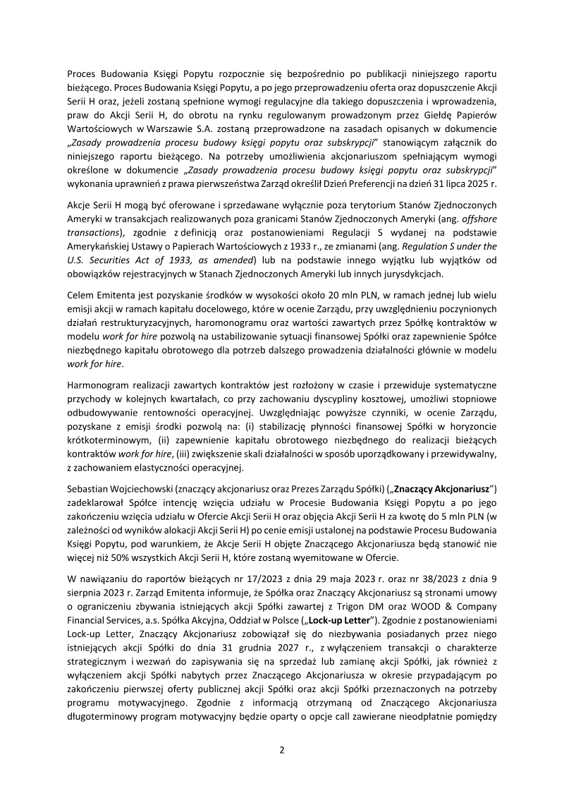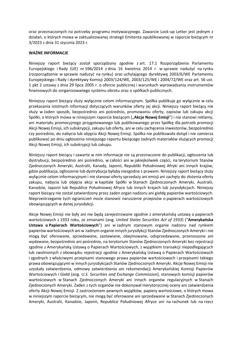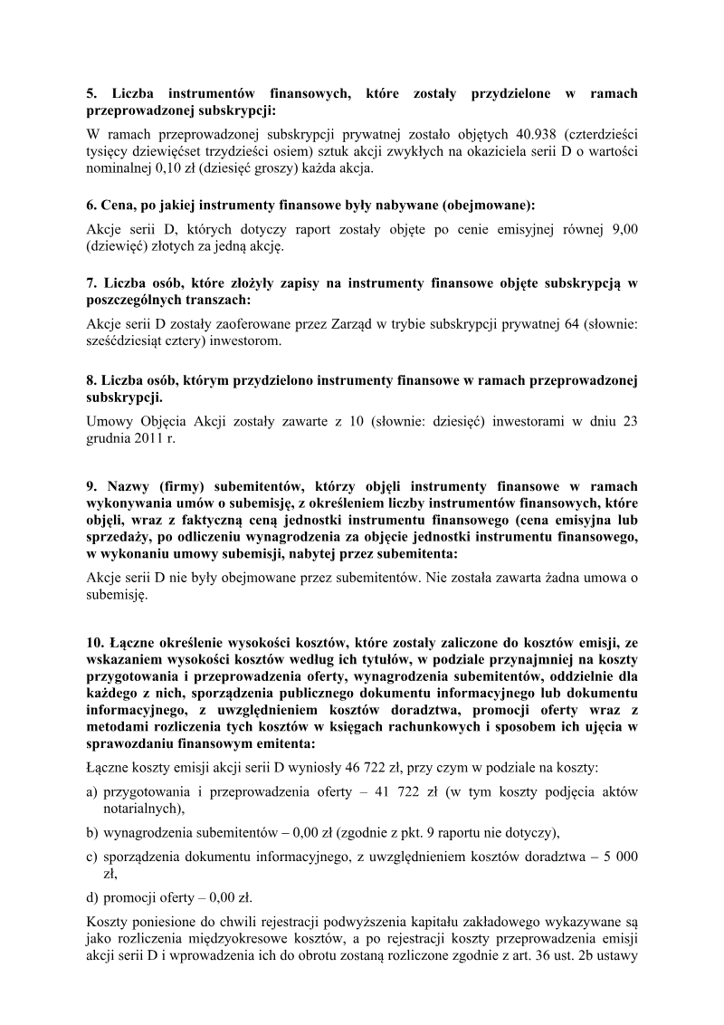 The announcement details the conclusion of a private subscription for ordinary bearer shares Series D issued by 11 Bit Studios S.A. The subscription, authorized on 10 November 2011 by a special general meeting to increase capital without existing shareholders’ subscription rights, commenced on 5 December 2011 and closed early on 9 January 2012, ahead of the originally stipulated 31 January deadline. The subscription capped at 500 000 shares, each with a nominal value of 0.10 zł. A total of 40 938 shares were actually subscribed and issued on 23 December 2011, at an emission price of 9.00 zł per share. The offering attracted 64 investors, but only ten entered into subscription agreements on the closing date; no sub‑emission arrangements were made. The transaction incurred total costs of 46 722 zł, comprising 41 722 zł for preparation and execution (including notarial fees), 5 000 zł for advisory and informational documentation, with no remuneration paid to sub‑emitters or promotion expenses. These costs are recorded as interim expenses and will be expensed upon registration of the capital increase in accordance with Polish accounting regulations. The report is confined to Poland, covering a single fiscal period (late 2011–early 2012) and the ordinary share segment of 11 Bit Studios. It follows statutory disclosure requirements under Polish corporate law and the Alternative Trading System regulations, providing a concise overview of subscription dates, share numbers, pricing, investor participation, and cost allocation.