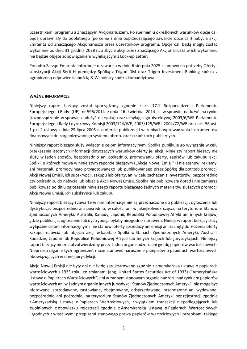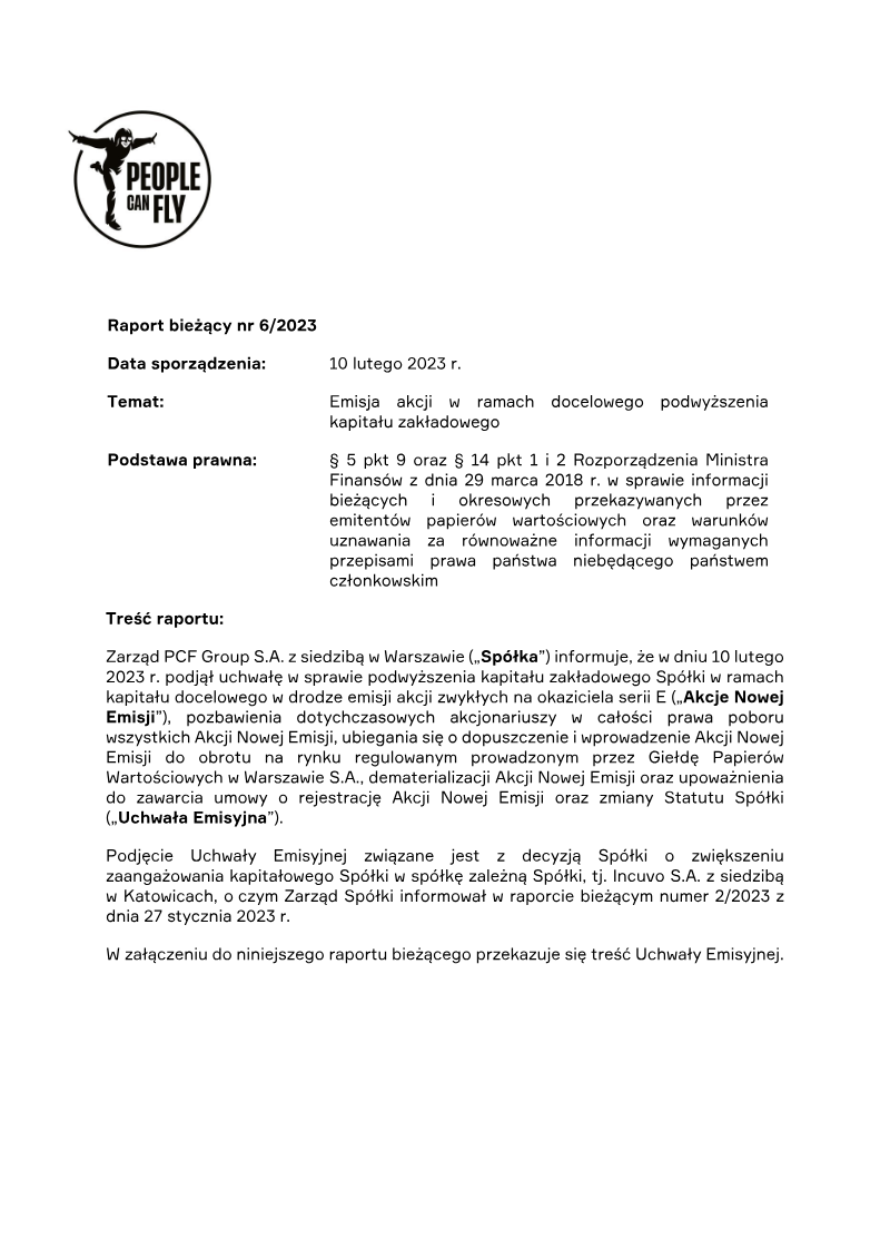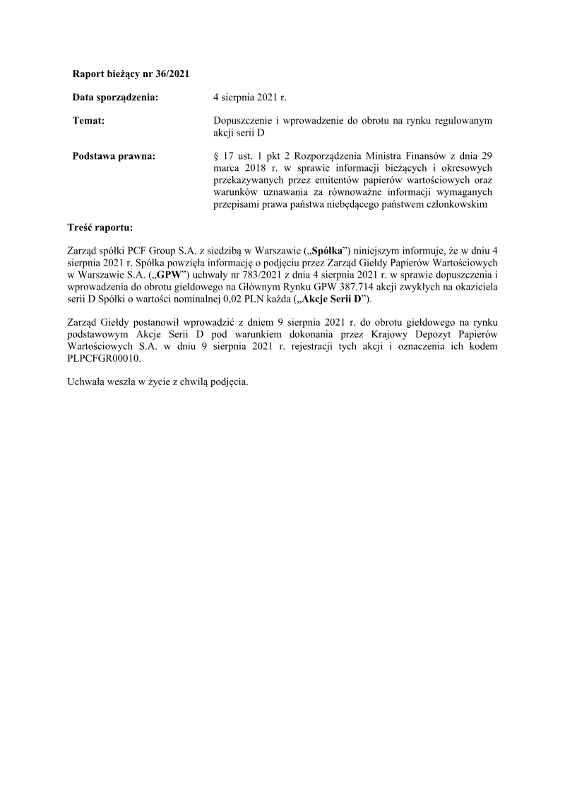 The report announces that PCF Group S.A., a Warsaw‑based company, has received approval from the Warsaw Stock Exchange (GPW) to list 387,714 bearer shares of Series D on the Main Market. The GPW board adopted decision 783/2021 on 4 August 2021, authorizing the admission and introduction of these shares to trading. The shares carry a nominal value of 0.02 PLN each and will be registered by the National Securities Depository (Krajowy Depozyt Papierów Wartościowych) on 9 August 2021, at which point they will receive the market code PLPCFGR00010. The decision became effective immediately upon adoption, allowing the shares to enter primary market trading from 9 August 2021. The document is a regulatory filing under Polish financial legislation, specifically §17(1)(2) of the Minister of Finance Regulation dated 29 March 2018, which governs current and periodic information required from issuers. The filing covers a single geographic jurisdiction—Poland—and pertains exclusively to the equity segment of the regulated market. No survey or statistical methodology is presented; the report simply records the administrative approval and registration timeline for the new share class. The information is intended to inform market participants of the availability of Series D shares for trading and the procedural steps completed by the issuer and exchange.