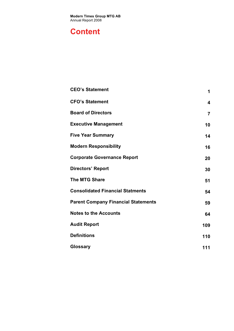 CEO’s Statement 1 CFO’s Statement 4 Board of Directors 7 Executive Management 10 Five Year Summary 14 Modern Responsibility 16 Corporate Governance Report 20 Directors’ Report 30 The MTG Share 51 Consolidated Financial Statments 54 Parent Company Financial Statements 59 Notes to the Accounts ...
