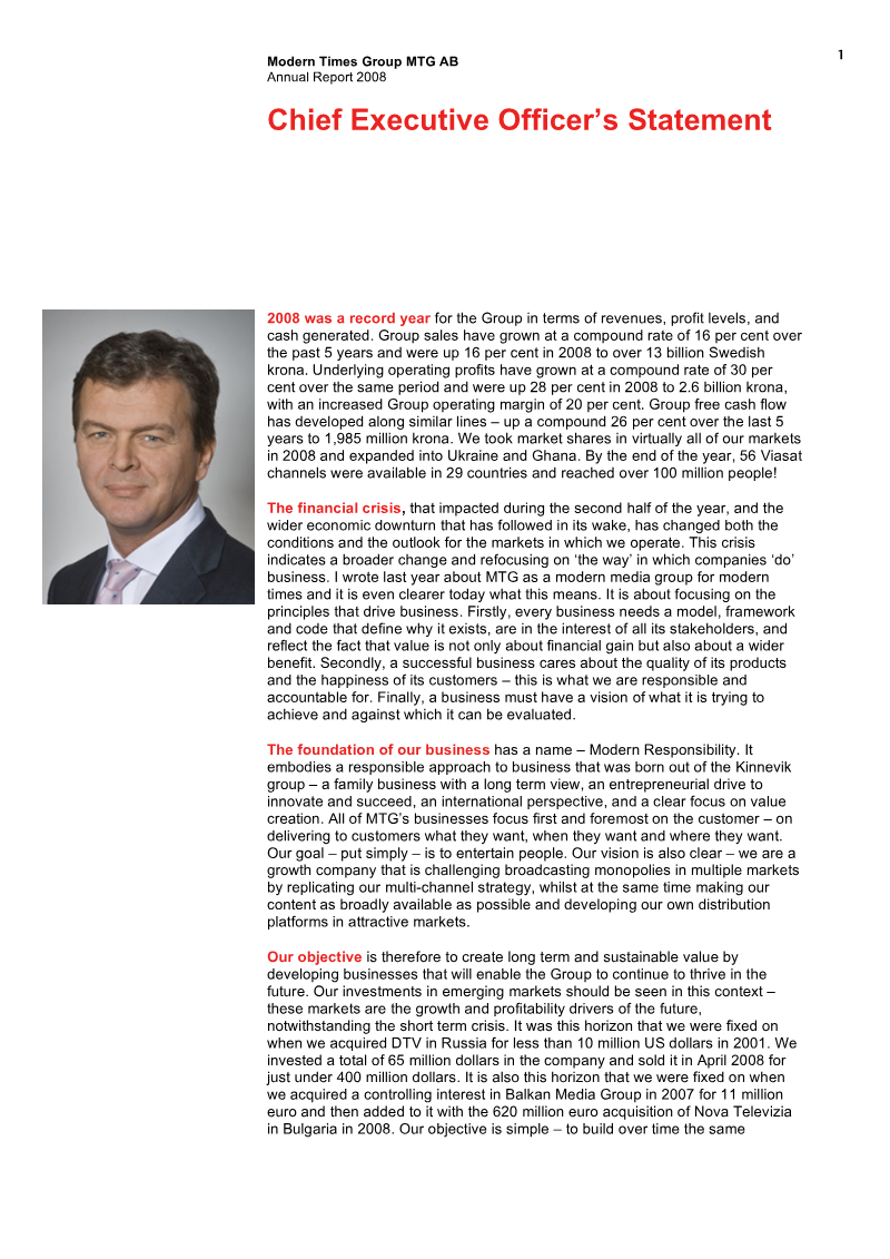 Consolidated Financial Statements Parent Company Financial Statements Record sales in a year of transformation Thank you for taking the time to read this report today. I hope that we have had the opportunity to meet face to face since I took over as CEO of this amazing company in September 2012 and, if not, I hope that we will do soon. I have been with MTG for over 19 years now and it has been an incredible journey.